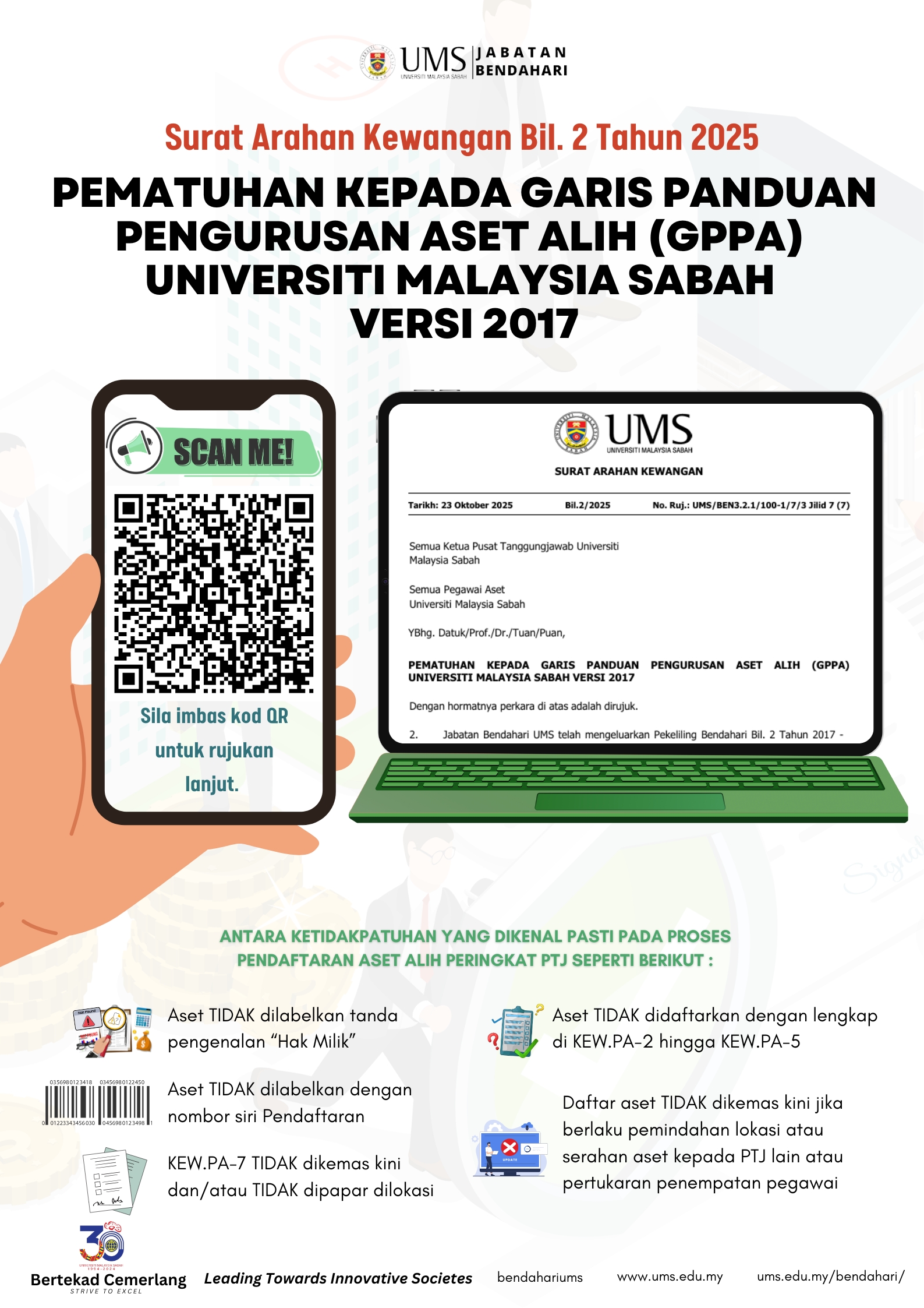 2. Bersama ini dilampirkan poster berkaitan Surat Arahan Kewangan Bil. 2 Tahun 2025 - Pematuhan Kepada Garis Panduan Pengurusan Aset Alih (GPPA) Universiti Malaysia Sabah Versi 2017 untuk tujuan hebahan kepada semua PTJ. Surat Arahan Kewangan ini juga boleh dicapai melalui pautan berikut:
