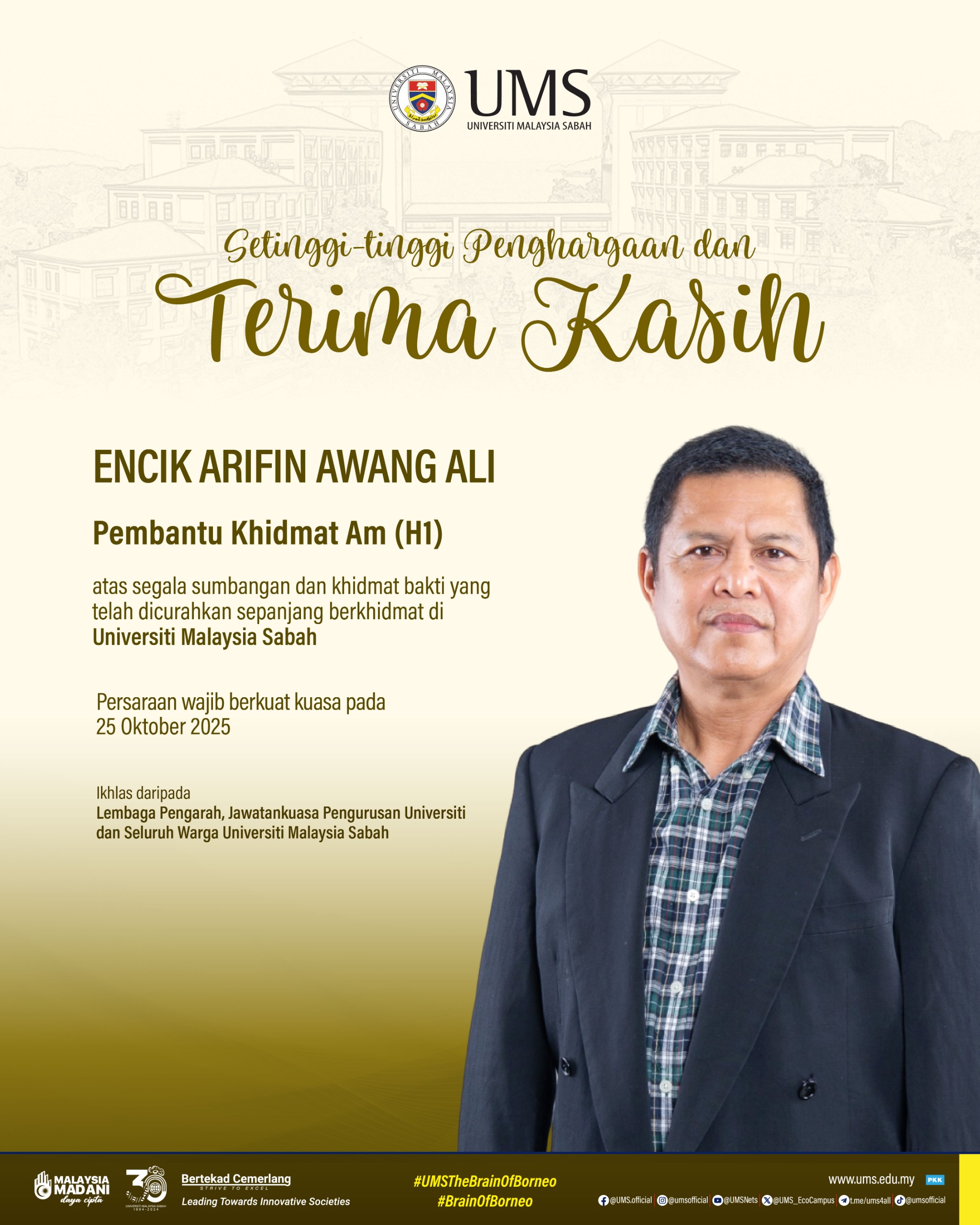27 Oktober 2025 Jumlah paparan: 125 Sekalung Penghargaan Dan Ucapan Terima Kasih Kepada Kakitangan UMS Yang Telah Bersara Cetak Emel Pengumuman Daripada: Bahagian Pengurusan Sumber Manusia