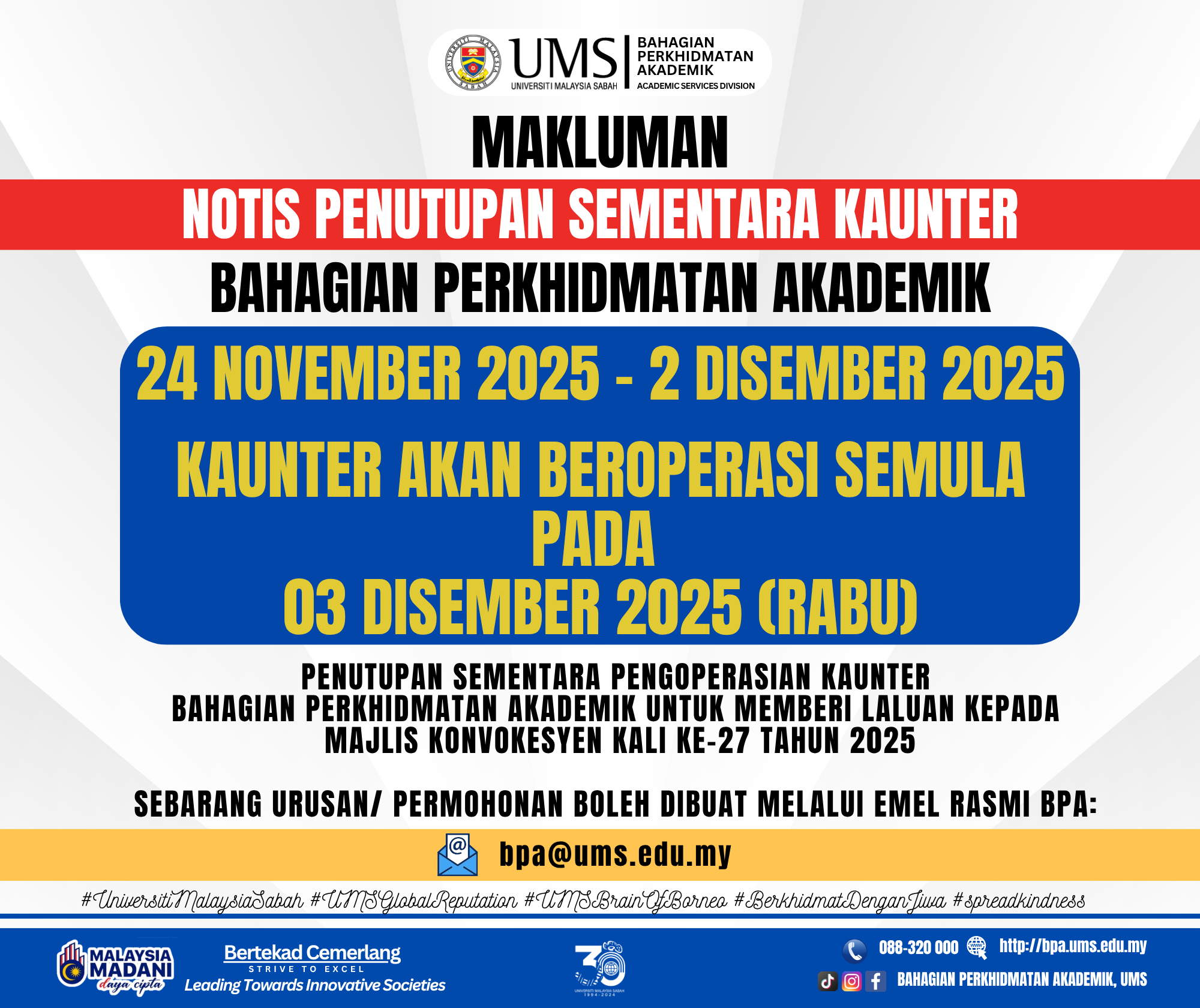 Perkhidmatan Kaunter Bahagian Perkhidmatan Akademik akan ditutup sementara bermula 24 November 2025 sehingga 2 Disember 2025 bagi memberi laluan kepada Majlis Konvokesyen UMS Kali ke-27 Tahun 2025.