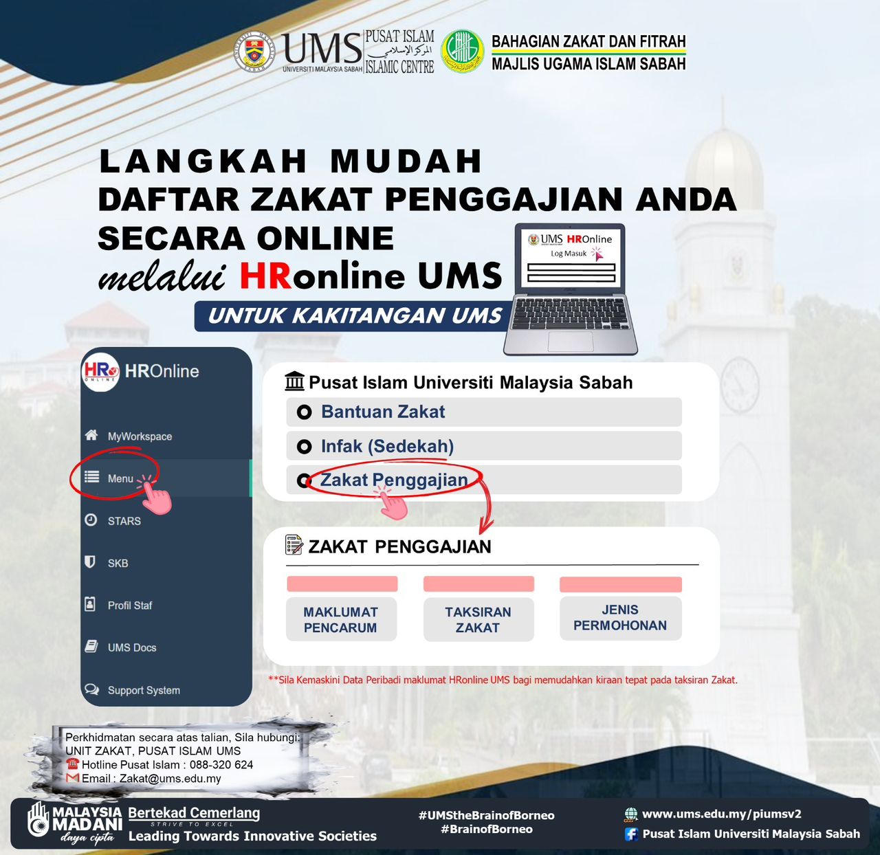 Makluman untuk kakitangan UMS, bayaran zakat bagi pencarum baharu dan pencarum sedia ada boleh dilakukan secara dalam talian melalui portal rasmi HROnline UMS.