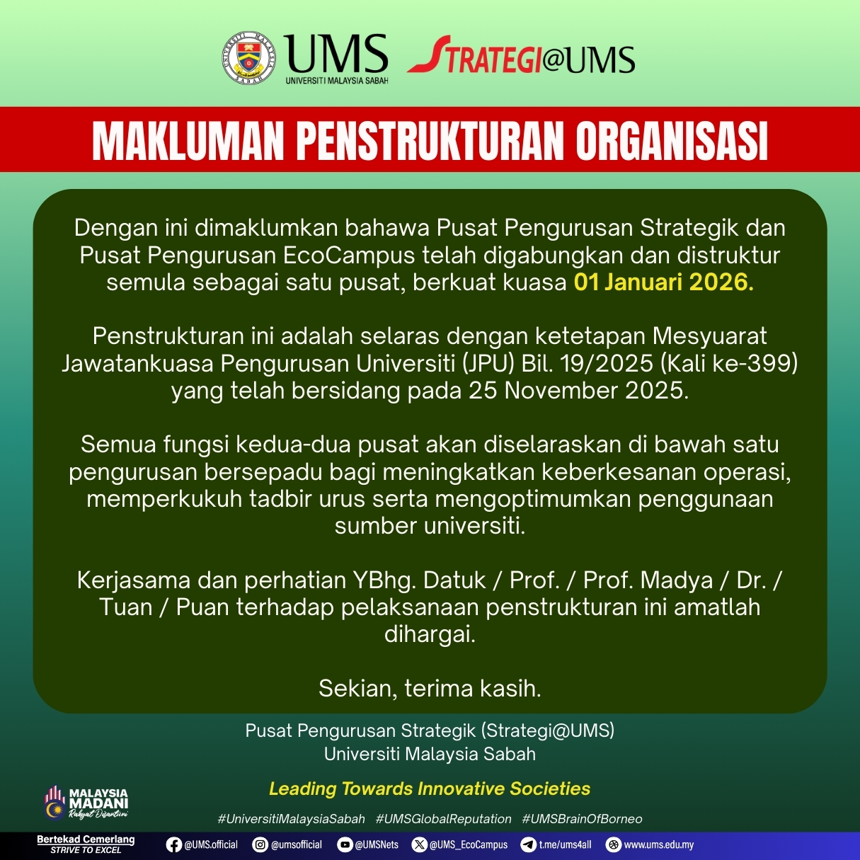 12 Januari 2026 Jumlah paparan: 339 Makluman Penstrukturan Organisasi Cetak Emel Pengumuman Daripada: Pusat Pengurusan Strategik