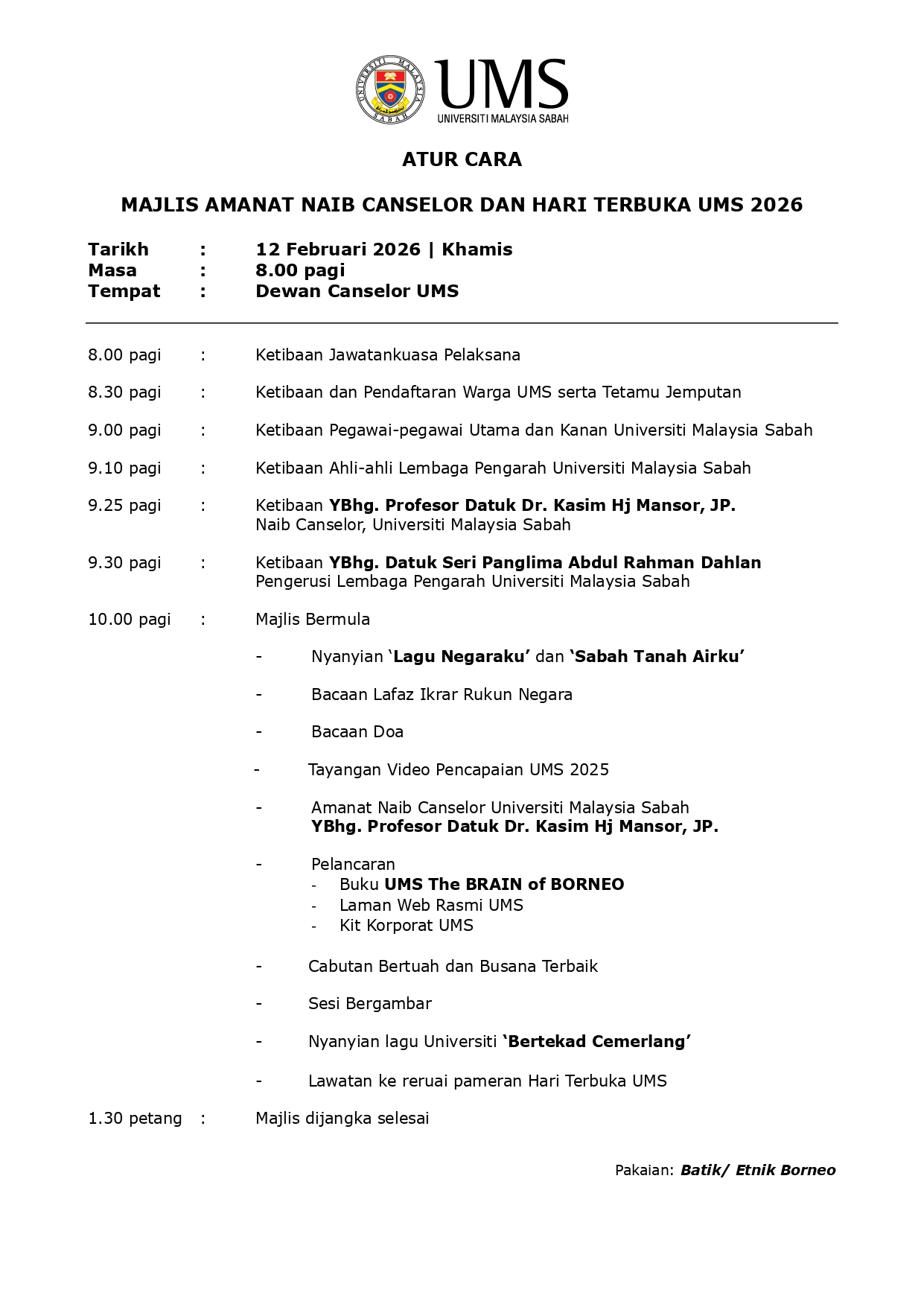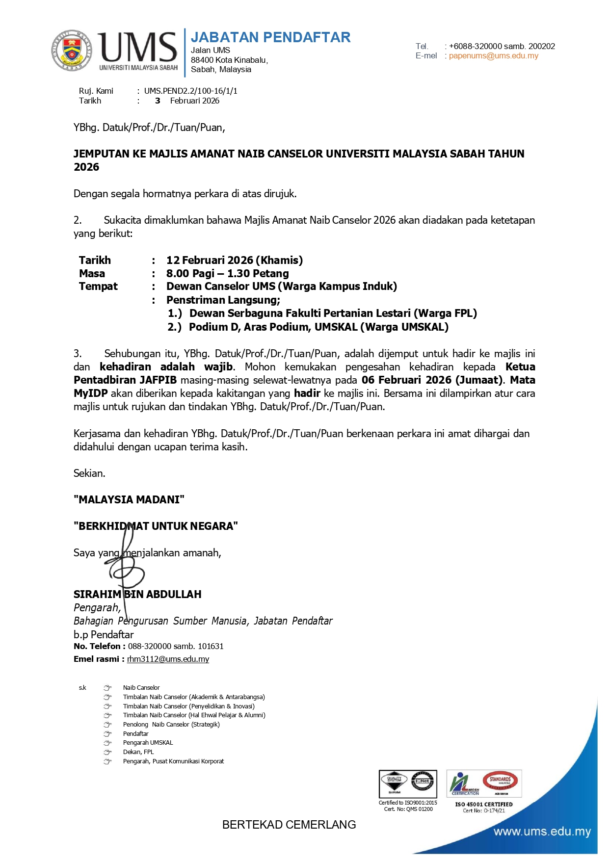 04 Februari 2026 Jumlah paparan: 862 Jemputan Ke Majlis Amanat Naib Canselor UMS Tahun 2026 Cetak Emel Pengumuman Daripada: Bahagian Pengurusan Sumber Manusia