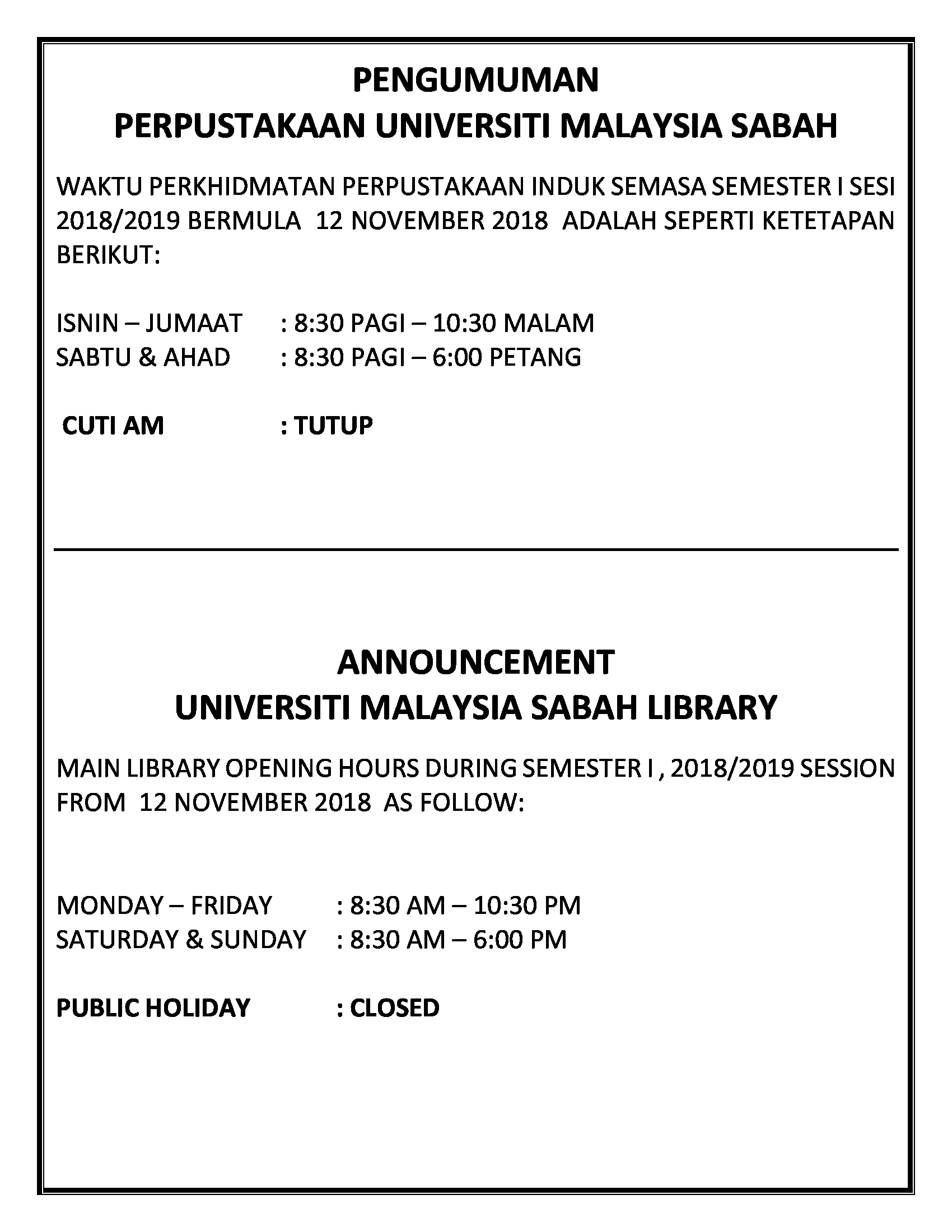 07 November 2018 Jumlah paparan: 1626 PERKHIDMATAN PERPUSTAKAAN SEMASA SEMESTER BERMULA 12 NOVEMBER 2018 Cetak Emel Pengumuman Daripada: Perpustakaan, UMSSubjek: Perkhidmatan Perpustakaan Semasa Semester Bermula 12 November 2018