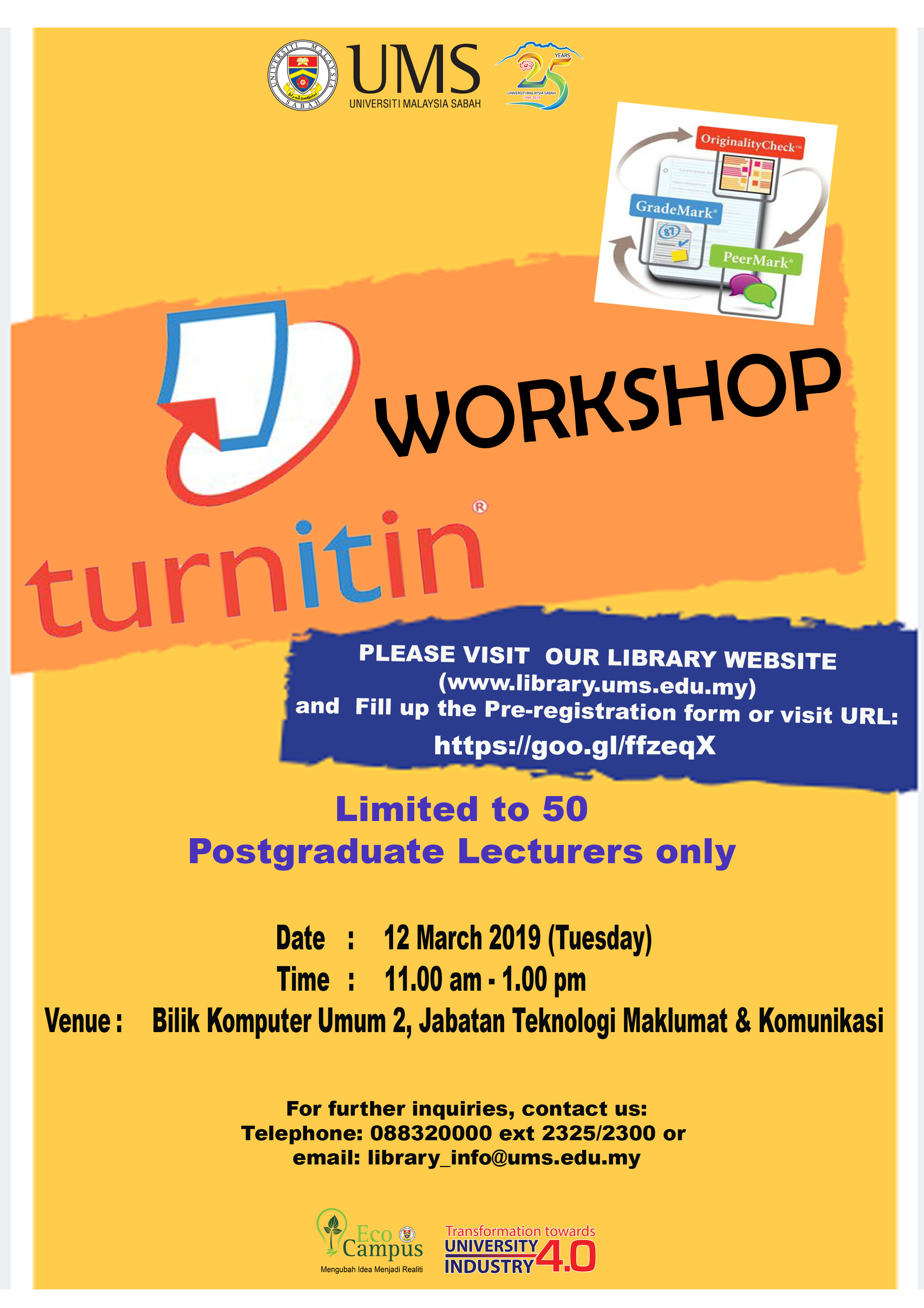 Sukacita dimaklumkan Perpustakaa UMS akan menganjurkan Bengkel Turnitin yang bertujuan memberi kefahaman dan penerangan jelas tentang penggunaan sistem tersebut. Penyertaan adalah TERHAD kepada ahli akademik yang menyelia pelajar pascasiswazah. Maklumat bengkel adalah seperti berikut :-