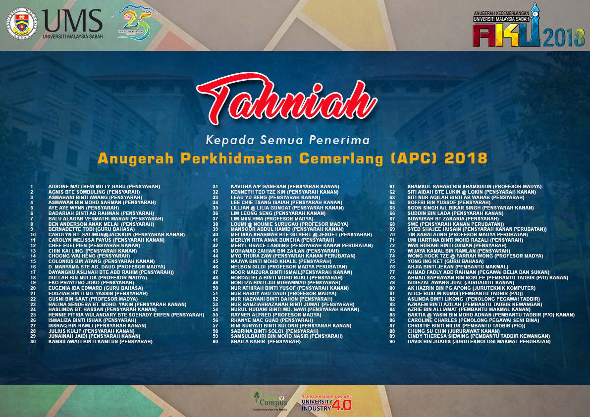 SUBJEK : UCAPAN TAHNIAH KEPADA PENERIMA ANUGERAH PERKHIDMATAN CEMERLANG (APC) TAHUN 2018.
