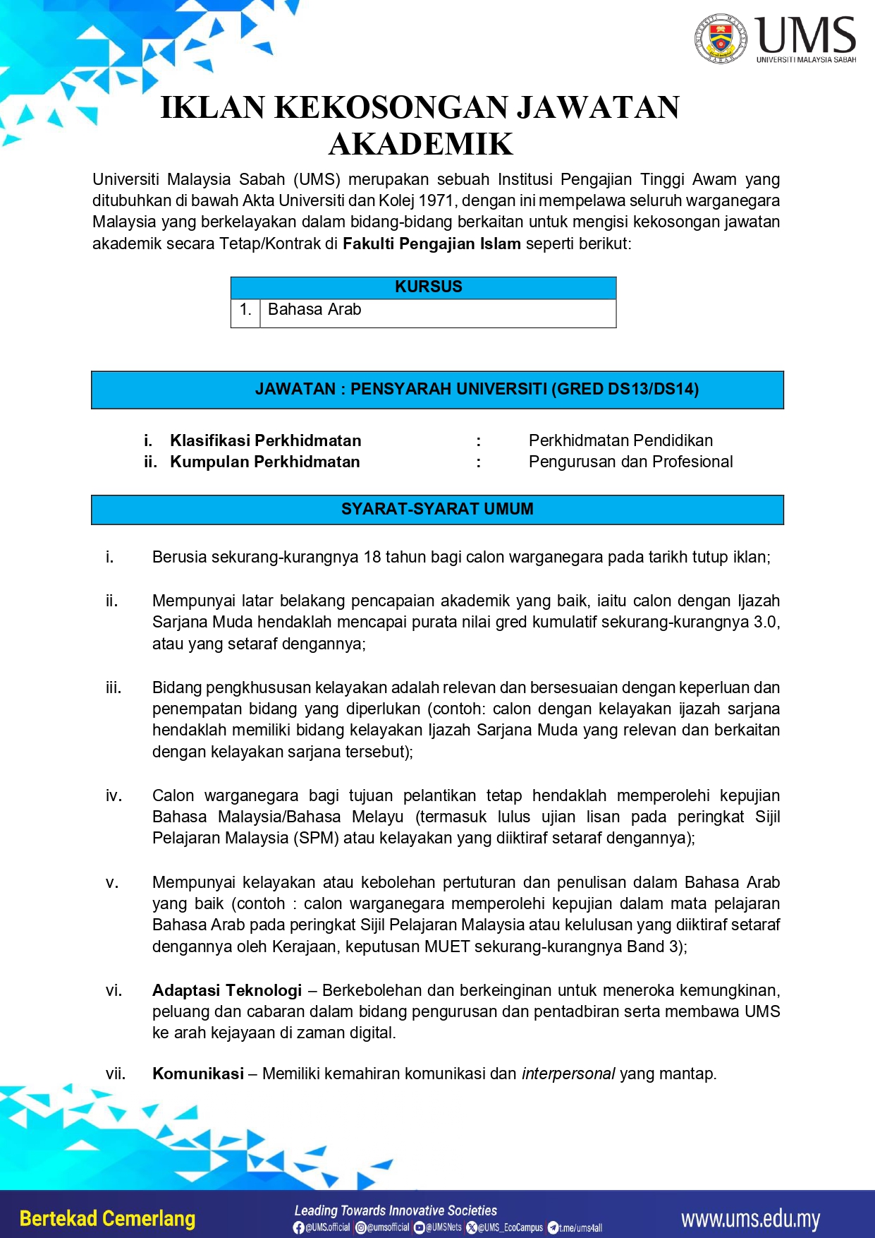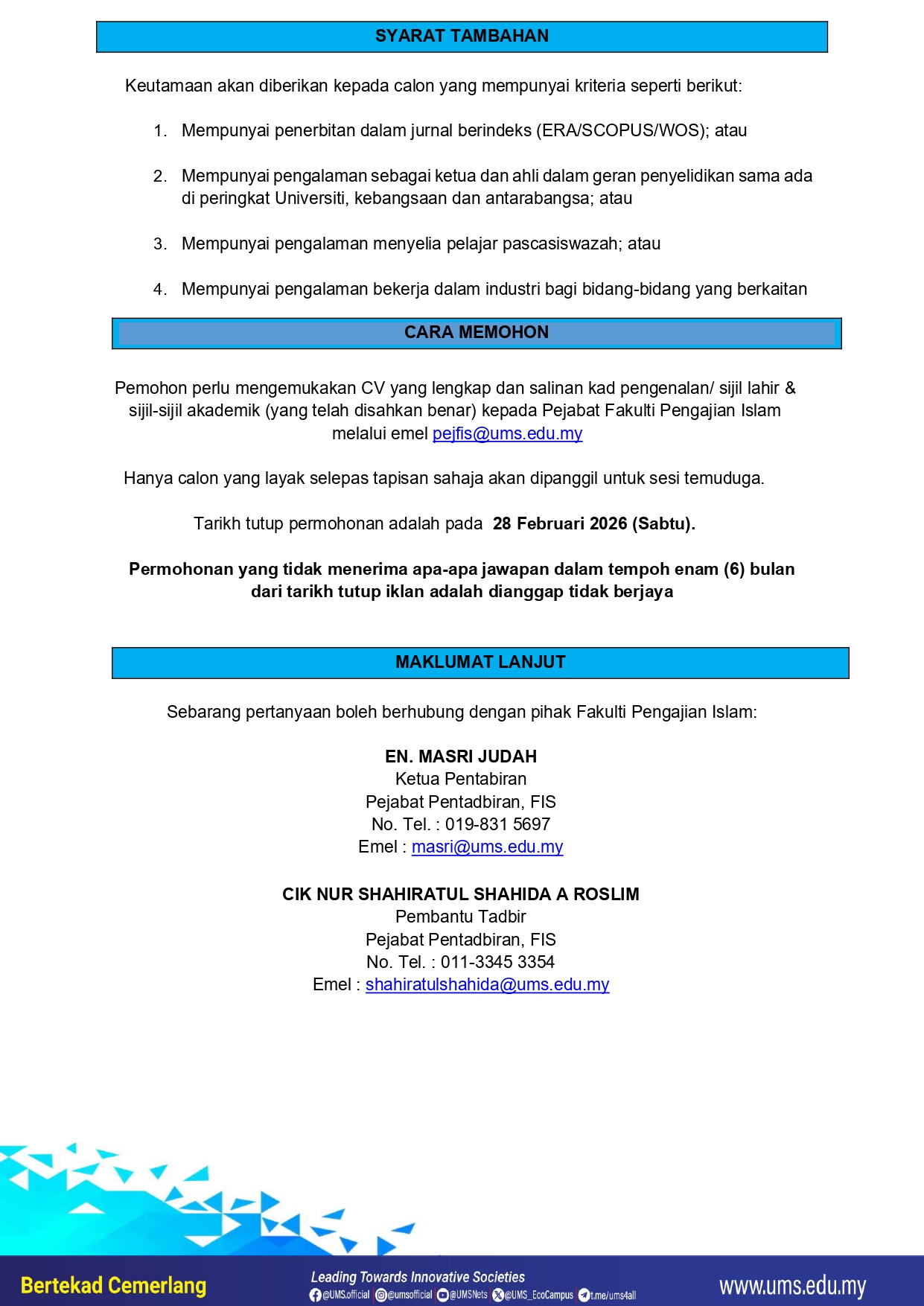 3.Sehubungan dengan itu, semua individu yang memenuhi syarat kelayakan adalah dipelawa untuk mengemukakan permohonan masing-masing bagi dipertimbangkan ke jawatan tersebut dengan melengkapkan borang permohonan melalui pautan berikut, https://registrar.utm.my/epengambilan