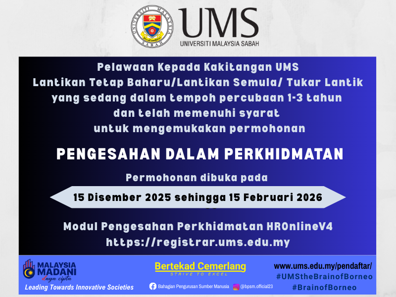 2.    Sukacita dimaklumkan bahawa, pihak Bahagian Pengurusan Sumber Manusia (BPSM), Jabatan Pendaftar mempelawa kepada semua kakitangan UMS Lantikan tetap/ baharu/lantikan semula/ tukar lantik yang memenuhi syarat untuk mengemukakan permohonan Pengesahan Dalam Perkhidmatan melalui modul modul Pengesahan Perkhidmatan HROnlineV4: https://registrar.ums.edu.my/