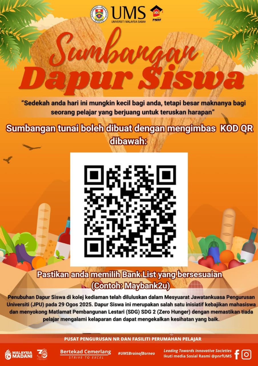 Dengan sukacitanya dimaklumkan bahawa Pusat Pengurusan NR dan Fasiliti Perumahan Pelajar, Universiti Malaysia Sabah (UMS) sedang melaksanakan dua inisiatif kebajikan bersempena usaha membantu kebajikan pelajar, iaitu: