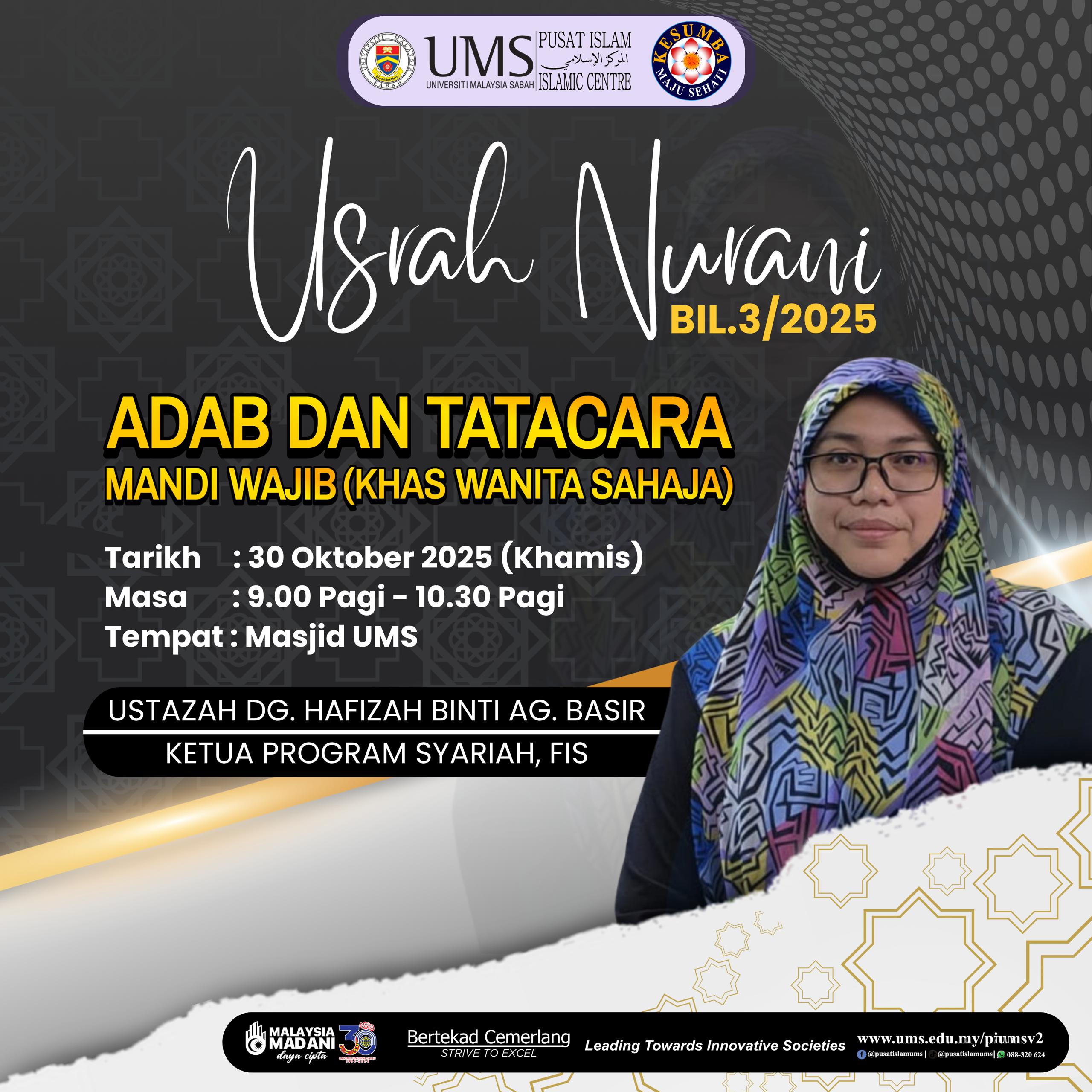 Pusat Islam UMS dengan kerjasama Kelab Suri Rumah dan Staf Wanita (KESUMBA) UMS sukacitanya menjemput semua mahasiswi dan staf wanita UMS untuk menghadiri Usrah Nurani Bil.3/2025 yang akan diadakan seperti berikut: