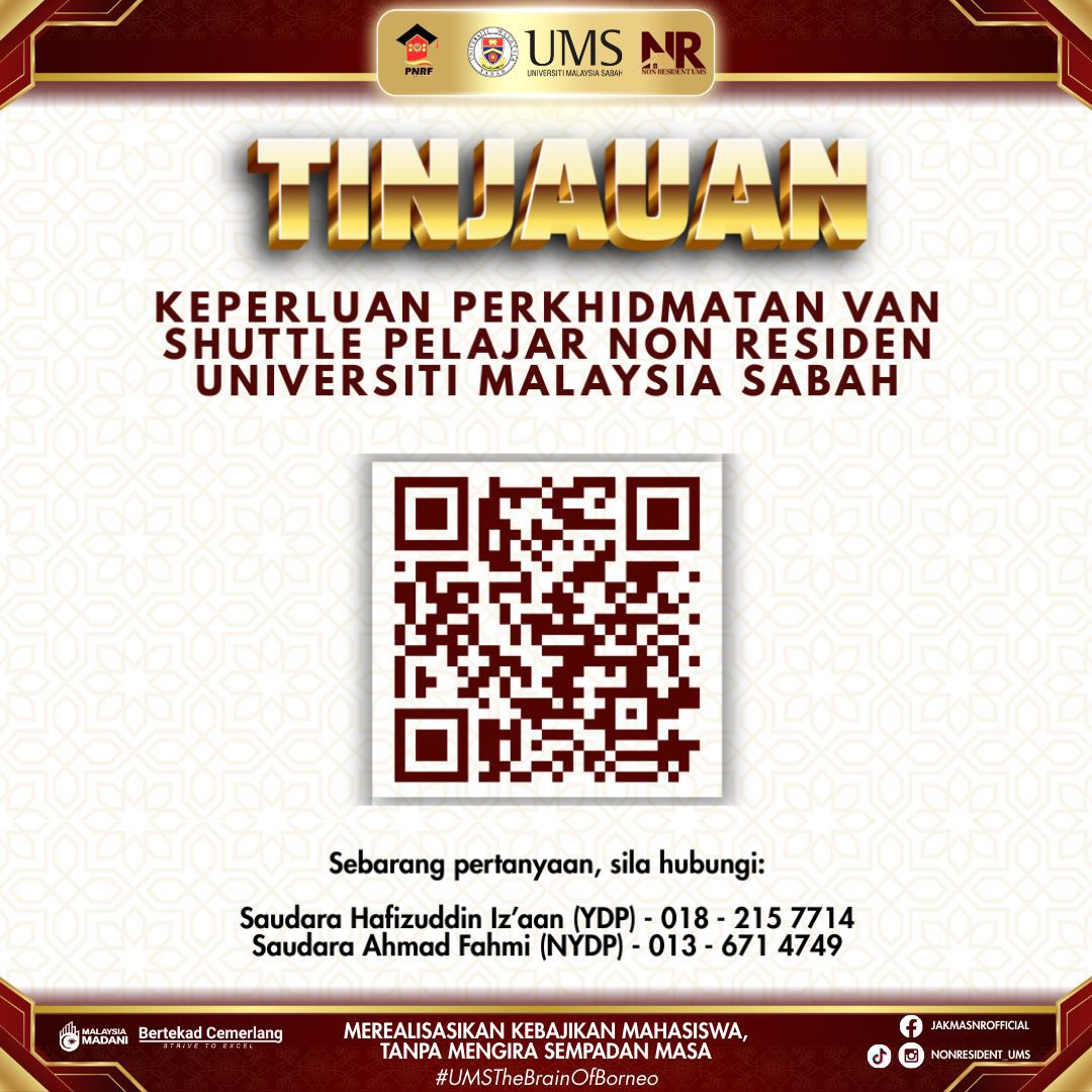 Pihak Jawatankuasa Kebajikan Mahasiswa Non Residen (JAKMAS NR) Sesi 2025/2026 sedang menjalankan satu tinjauan bagi menilai keperluan perkhidmatan van shuttle khusus untuk pelajar Non Residen Universiti Malaysia Sabah (UMS).