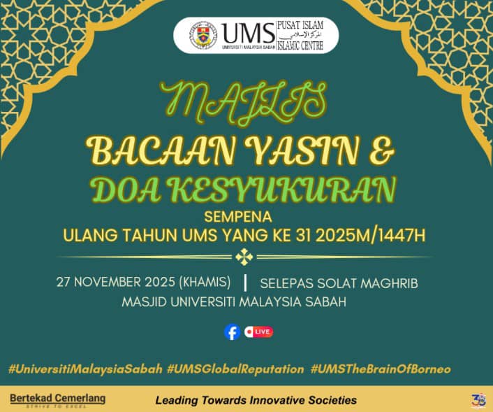 Dengan segala hormatnya, dimaklumkan bahawa Pusat Islam Universiti Malaysia Sabah (UMS) akan mengadakan Majlis Bacaan Yasin dan Doa Kesyukuran sempena ulang tahun UMS yang ke-31 pada ketetapan berikut:
