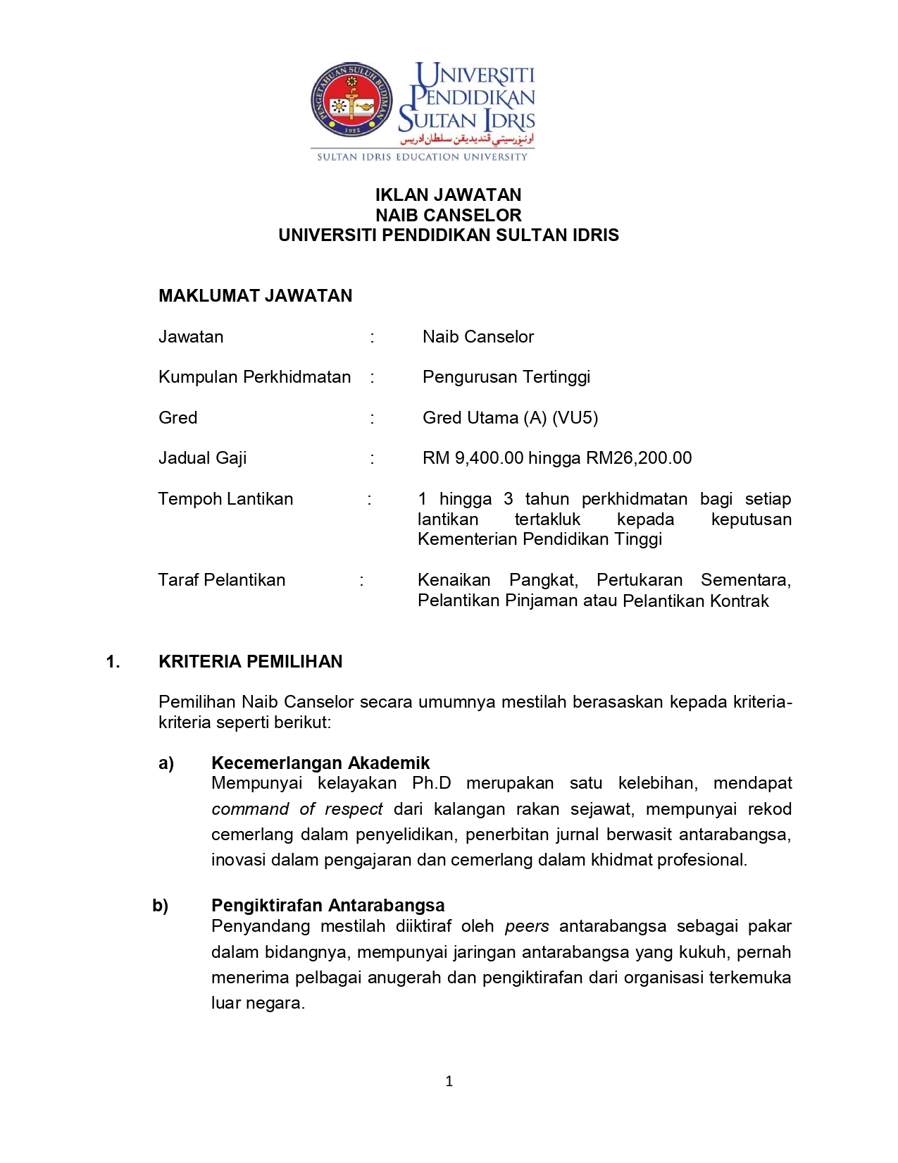 | Iklan Pengisian Jawatan Naib Canselor Universiti Pendidikan Sultan Idris | |