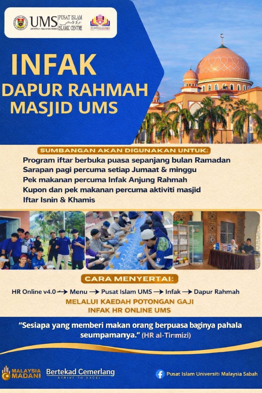 Pusat Islam Universiti Malaysia Sabah membuka peluang Infak Dapur Rahmah Masjid UMS melalui potongan gaji HR Online UMS.