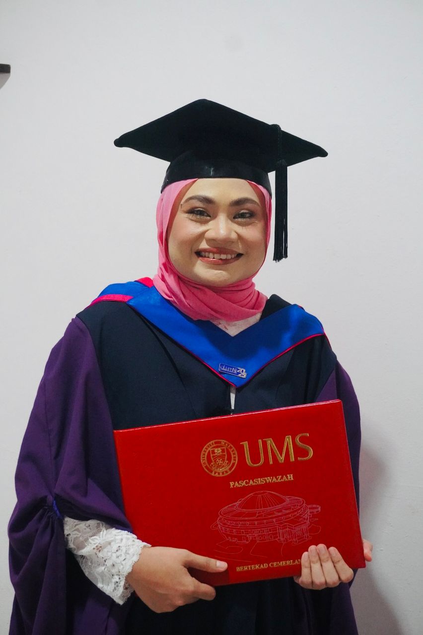 “Saya bukan saja jatuh cinta dengan bidang ilmu, tapi dengan para pensyarah dan komuniti UMS sendiri. Walaupun kami pelajar separuh masa, hubungan kami rapat seperti keluarga,” katanya.