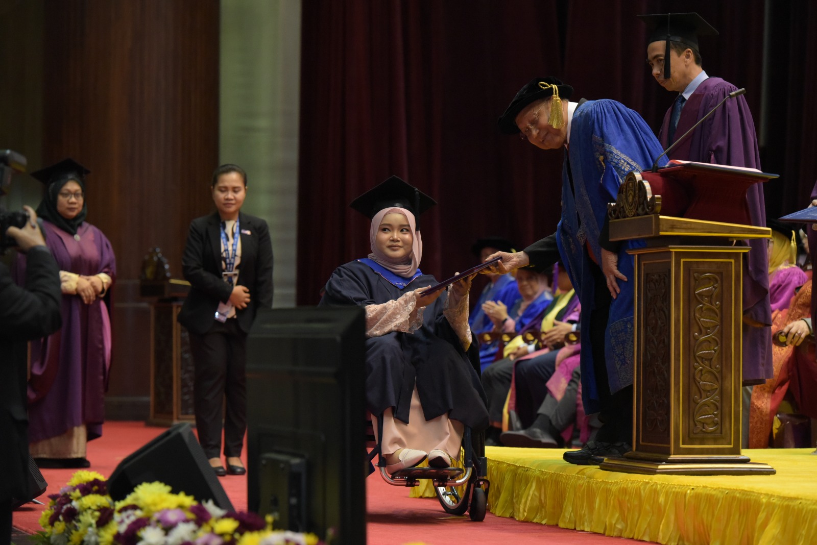 Suasana Majlis Konvokesyen Universiti Malaysia Sabah (UMS) bertukar sayu apabila pasangan ibu bapa naik ke pentas untuk menerima skrol ijazah Anumerta bagi pihak Allahyarhamah Farah Hasanah Abdul Jaid @ Abdul Kaid sebagai tanda penghormatan terakhir.