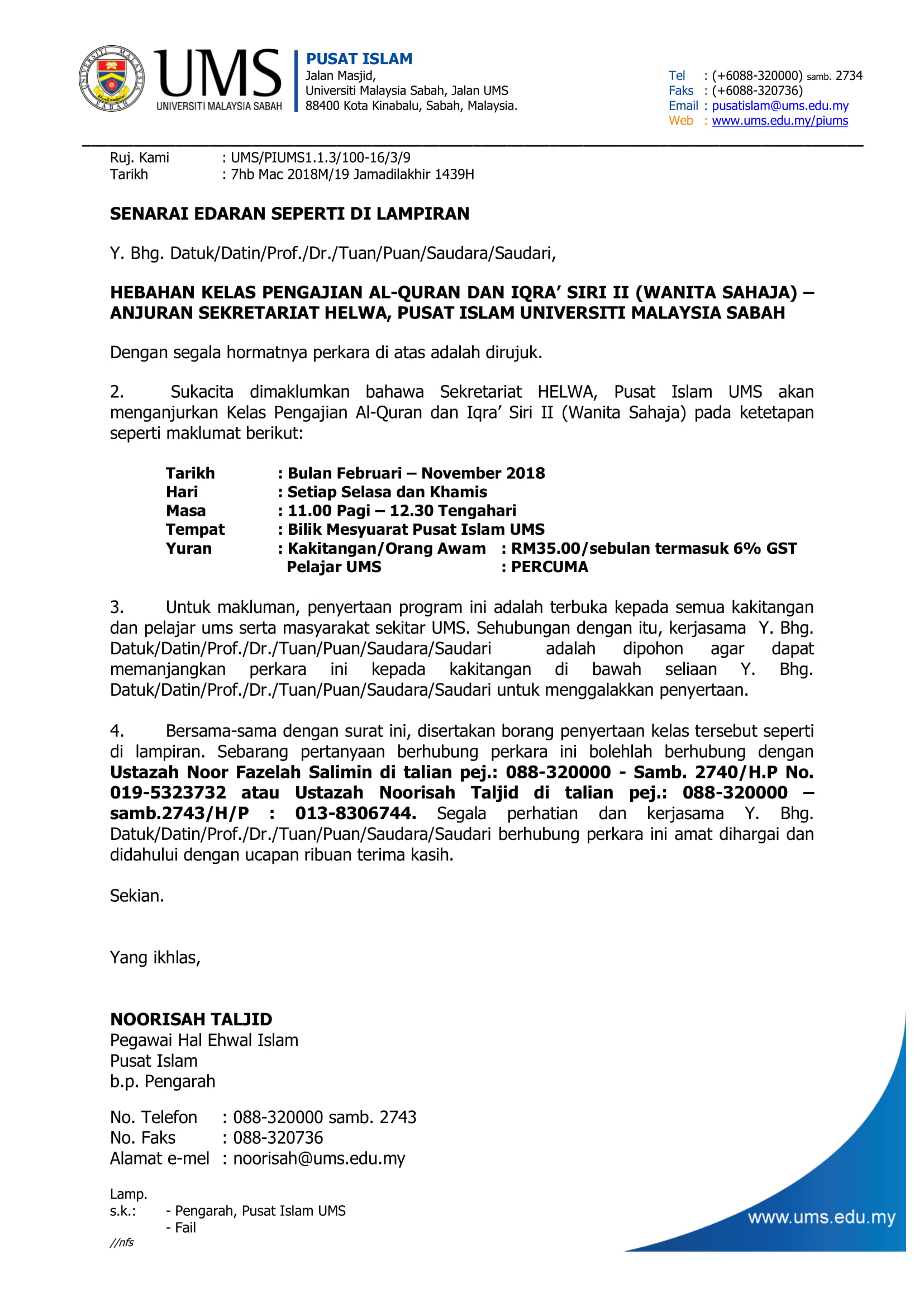 KANDUNGAN : Makluman penggunaan sistem rekod kehadiran seluruh kakitangan Universiti Malaysia Sabah secara atas Talian Bermula 1 April 2019,