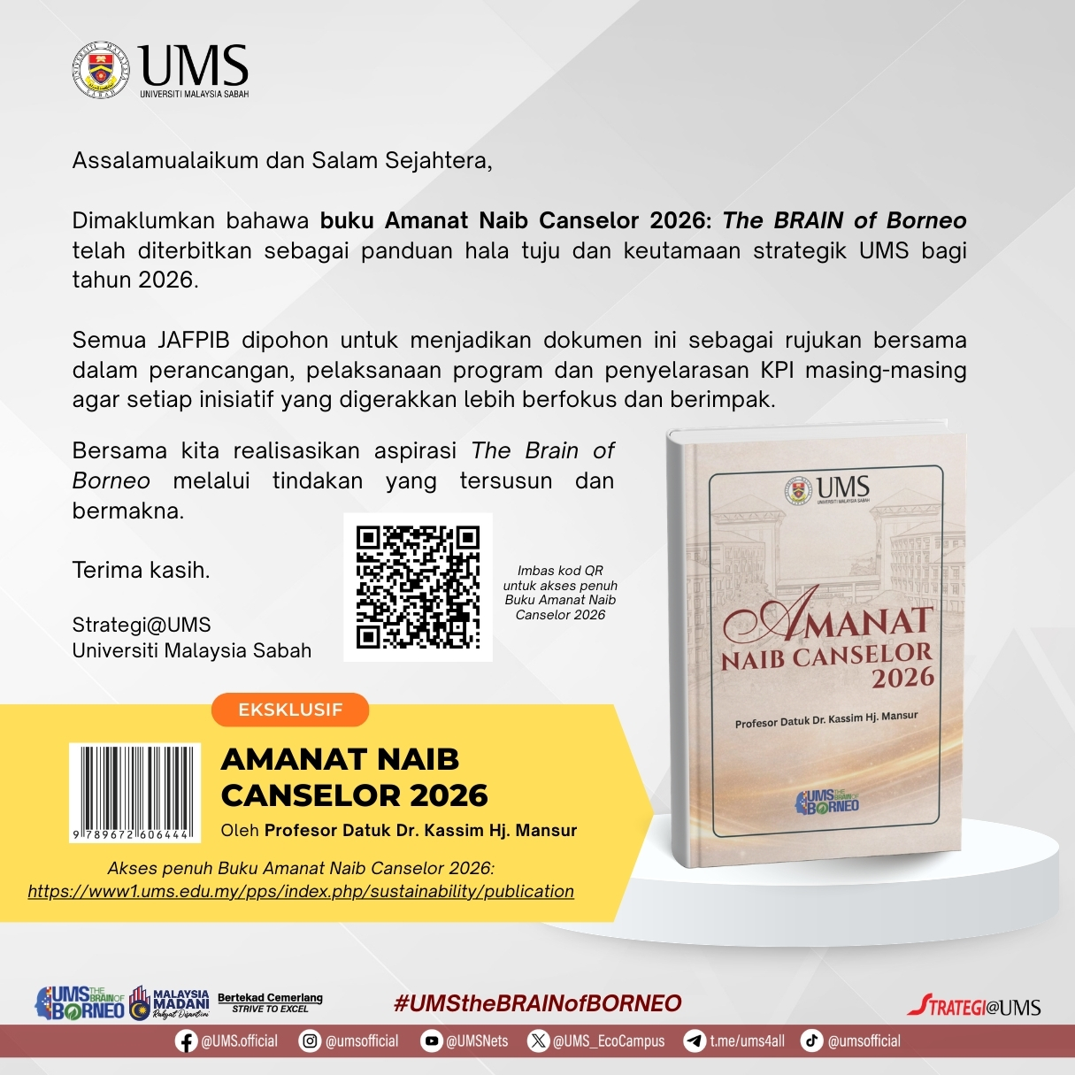 Dimaklumkan bahawa buku Amanat Naib Canselor 2026: The BRAIN of Borneo telah diterbitkan sebagai panduan hala tuju dan keutamaan strategik UMS bagi tahun 2026.