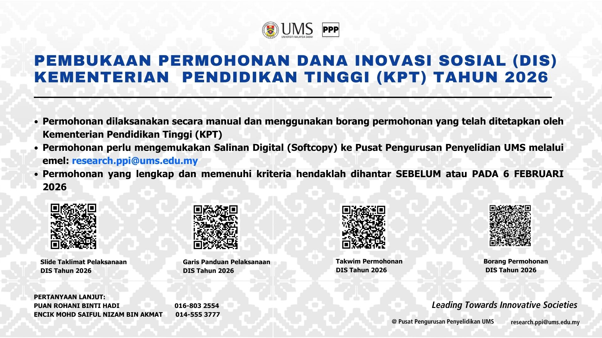 3. Sehubungan itu, semua permohonan yang telah melepasi saringan di peringkat institusi akan dikemukakan kepada pihak kementeriaan SEBELUM ATAU PADA 23 FEBRUARI 2026 untuk tindakan selanjutnya. YBrs. Datuk Prof./Prof./Dr./Tuan/Puan adalah dimohon untuk memanjangkan hebahan pembukaan permohonan ini kepada semua kakitangan akedemik UMS. Bersama-sama ini dilampirkan Garis Panduan Dana Inovasi Sosial (DIS) Tahun 2026, Slaid pembentangan, Borang dan Takwim permohonan.