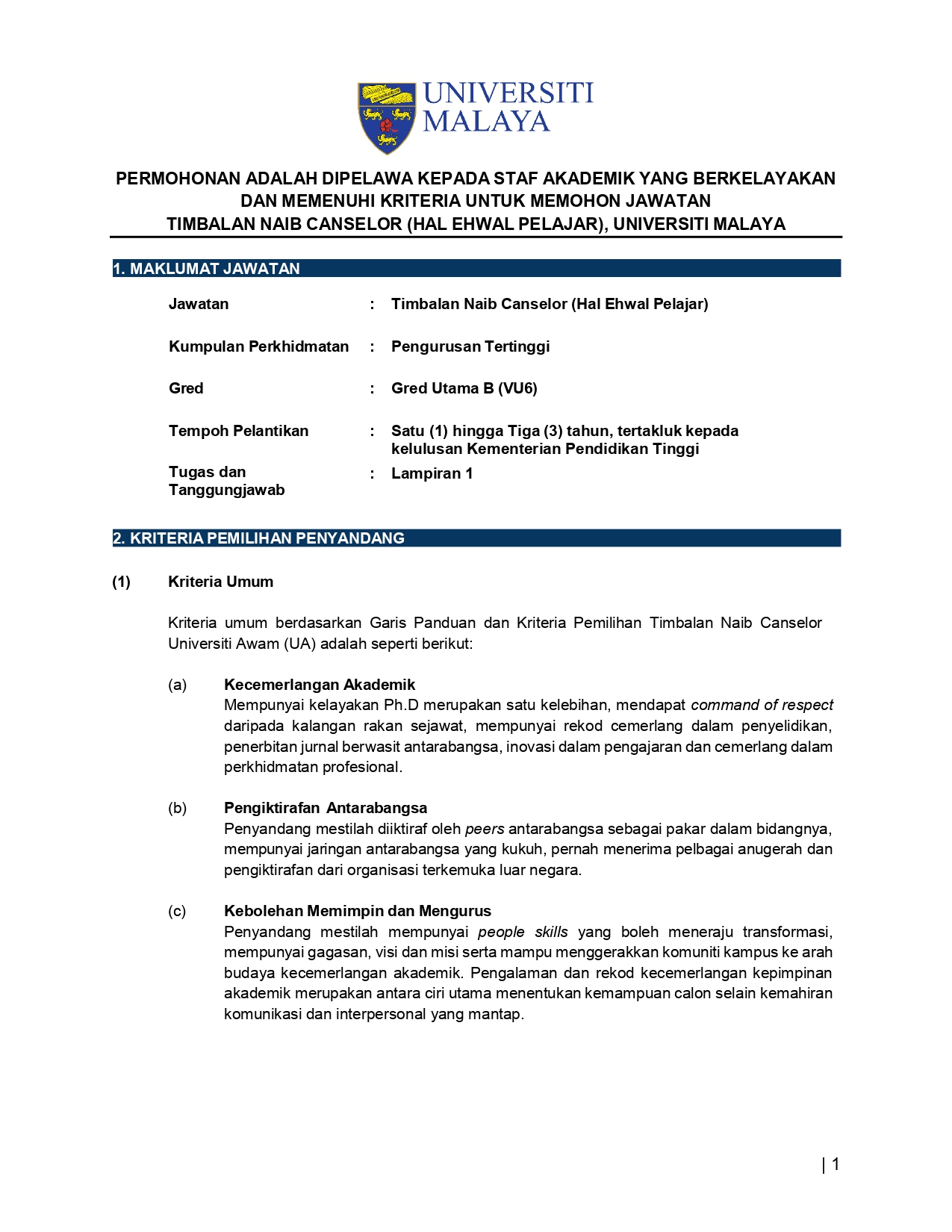 Iklan Jawatan Timbalan Naib Canselor (Hal Ehwal Pelajar) Gred Utama B (VU6) Universiti Malaya