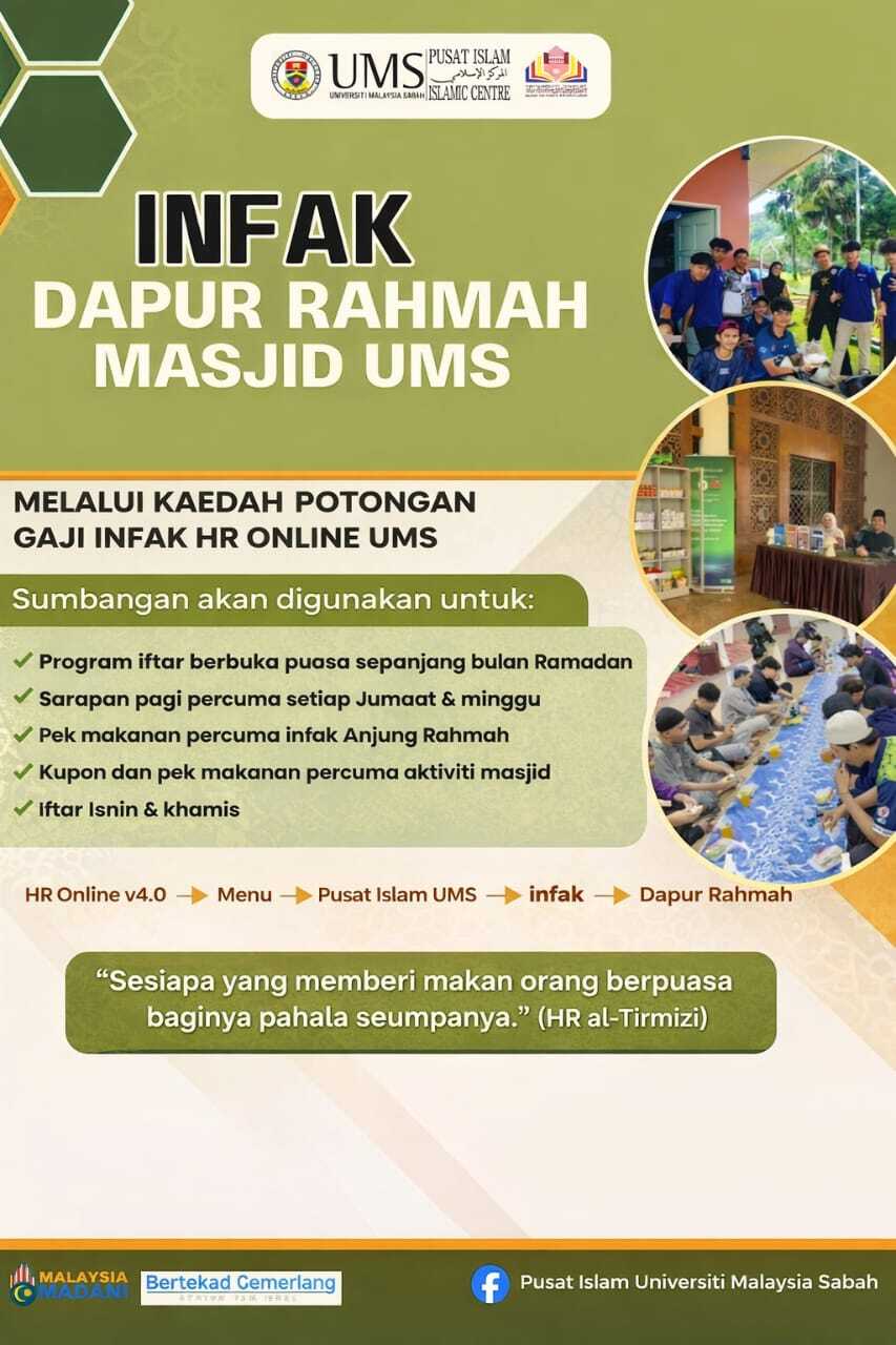 Pusat Islam Universiti Malaysia Sabah membuka peluang Infak Dapur Rahmah Masjid UMS melalui potongan gaji HR Online UMS.