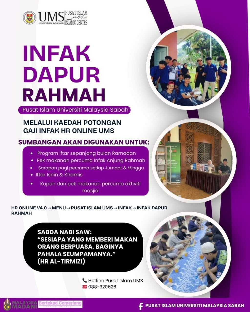 Pusat Islam Universiti Malaysia Sabah membuka peluang Infak Dapur Rahmah Masjid UMS melalui potongan gaji HR Online UMS.