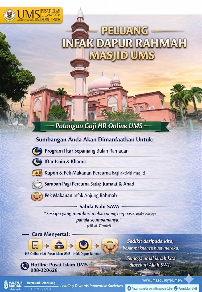 Pihak Pusat Islam UMS ingin mengajak seluruh warga universiti untuk bersama-sama menjayakan Program Infak Dapur Rahmah. Inisiatif ini bertujuan menyantuni mahasiswa dan jemaah melalui pelbagai bantuan seperti: