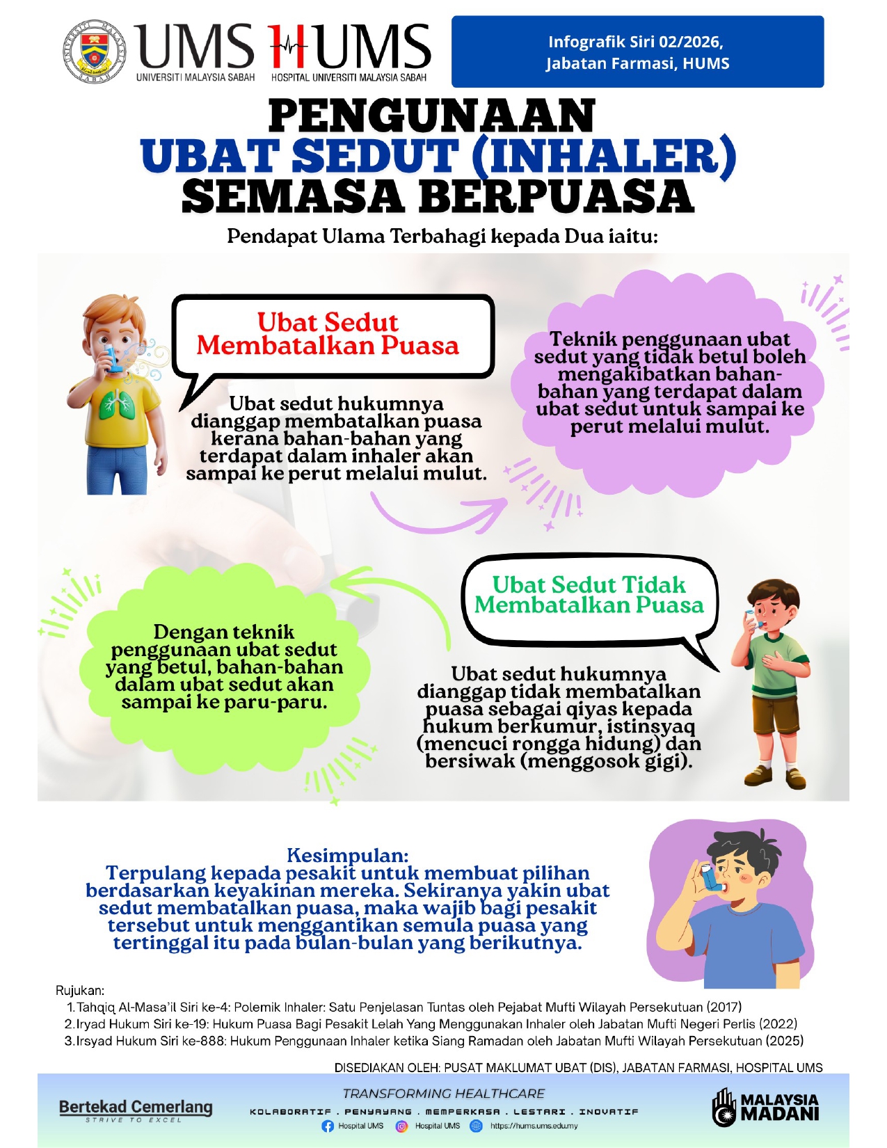 Dikongsikan infografik daripada Jabatan Farmasi HUMS berkenaan penggunaan ubat sedut (inhaler) semasa berpuasa yang menunjukkan pendapat ulama yang berbeza dan kesimpulannya.