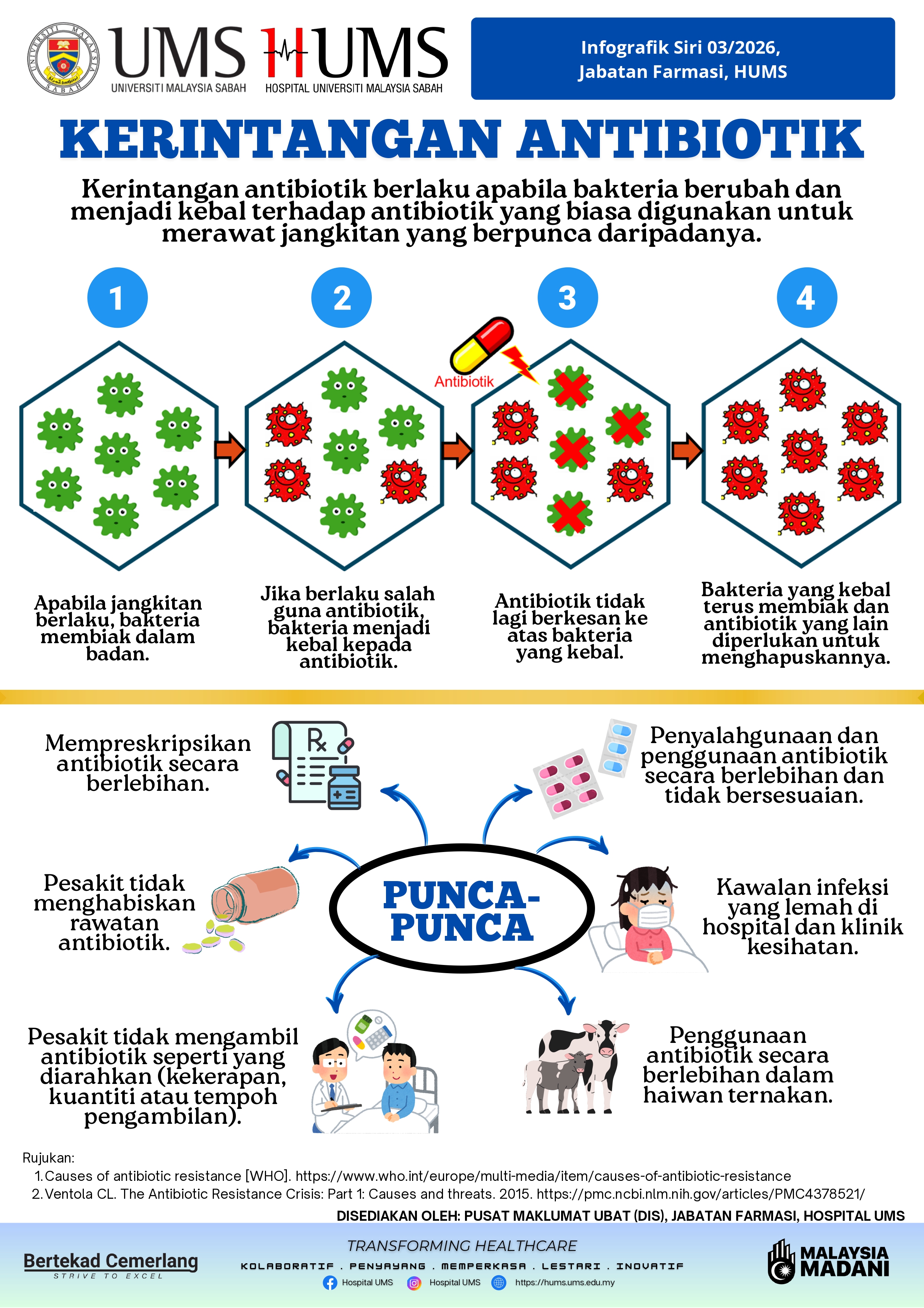 Dikongsikan infografik daripada Jabatan Farmasi HUMS berkenaan kerintangan antibiotik (antibiotic resistance) untuk informasi bersama. Isu ini semakin meningkat dan telah memberi impak yang besar kepada rawatan pesakit.