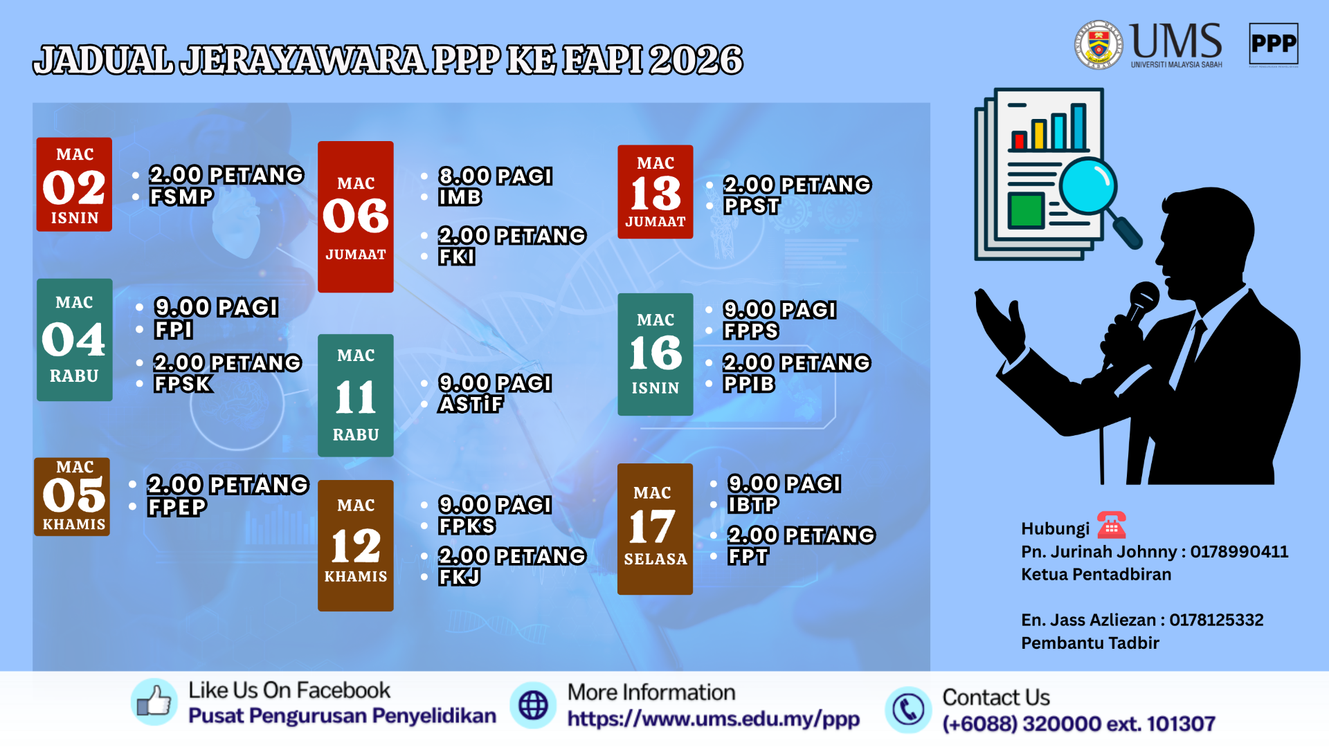 Sukacita dimaklumkan bahawa pihak Pusat Pengurusan Penyelidikan (PPP) akan menganjurkan Jerayawara PPP 2026 sepanjang bulan Ramadan. Program ini akan melibatkan kehadiran dan penyertaan pihak pengurusan fakulti masing-masing termasuk Pengarah, Timbalan Pengarah, Dekan, Timbalan Dekan serta semua pensyarah FAPI.