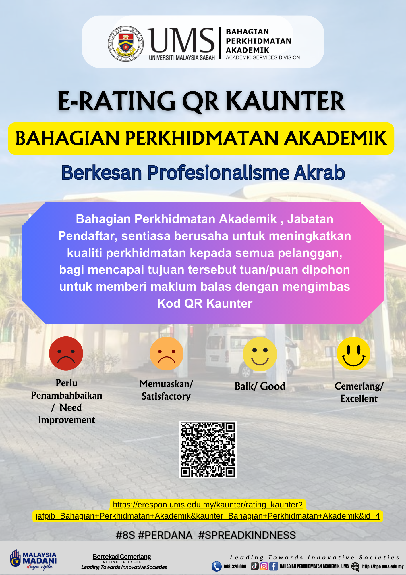 Bahagian Perkhidmatan Akademik , Jabatan Pendaftar, sentiasa berusaha untuk meningkatkan kualiti perkhidmatan kepada semua pelanggan, bagi mencapai tujuan tersebut tuan/puan dipohon untuk memberi maklum balas dan cadangan dengan melengkapkan borang soal selidik ini.
