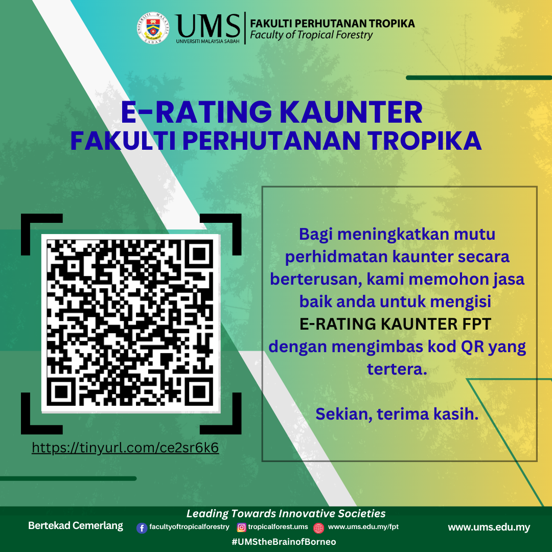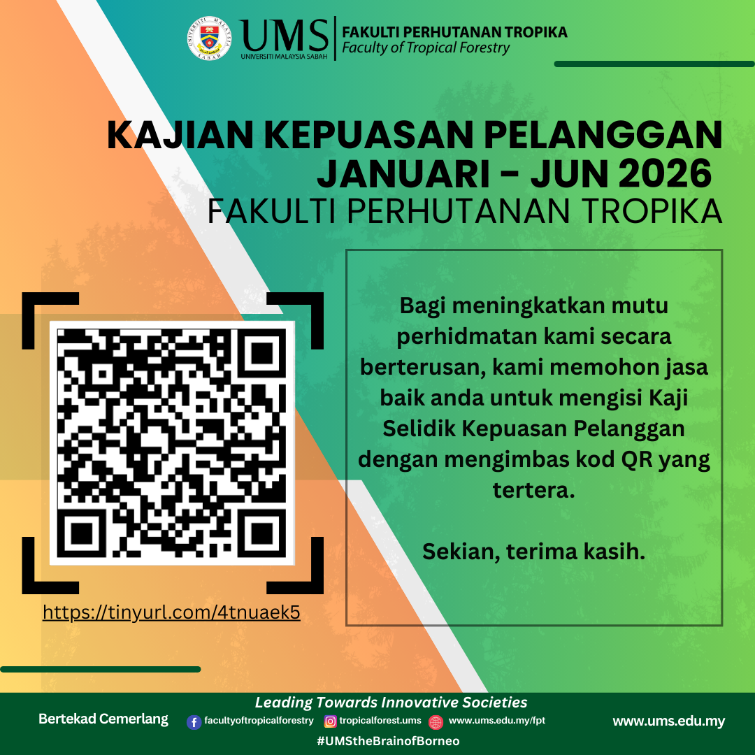 Fakulti Perhutanan Tropika ingin merakamkan setinggi-tinggi penghargaan atas sokongan dan kepercayaan YBhg. Prof./YBrs. Dr./Tuan/Puan terhadap perkhidmatan kami.