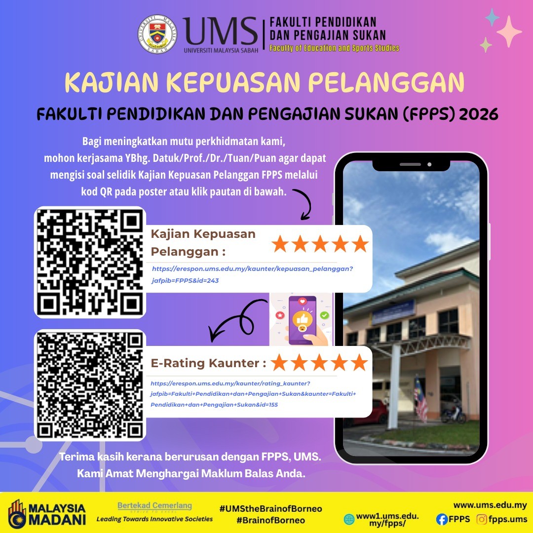 FAKULTI PENDIDIKAN DAN PENGAJIAN SUKAN (FPPS), sentiasa berusaha untuk meningkatkan kualiti perkhidmatan kepada semua pelanggan, bagi mencapai tujuan tersebut tuan/puan dipohon untuk memberi maklum balas dan cadangan dengan melengkapkan borang soal selidik ini.