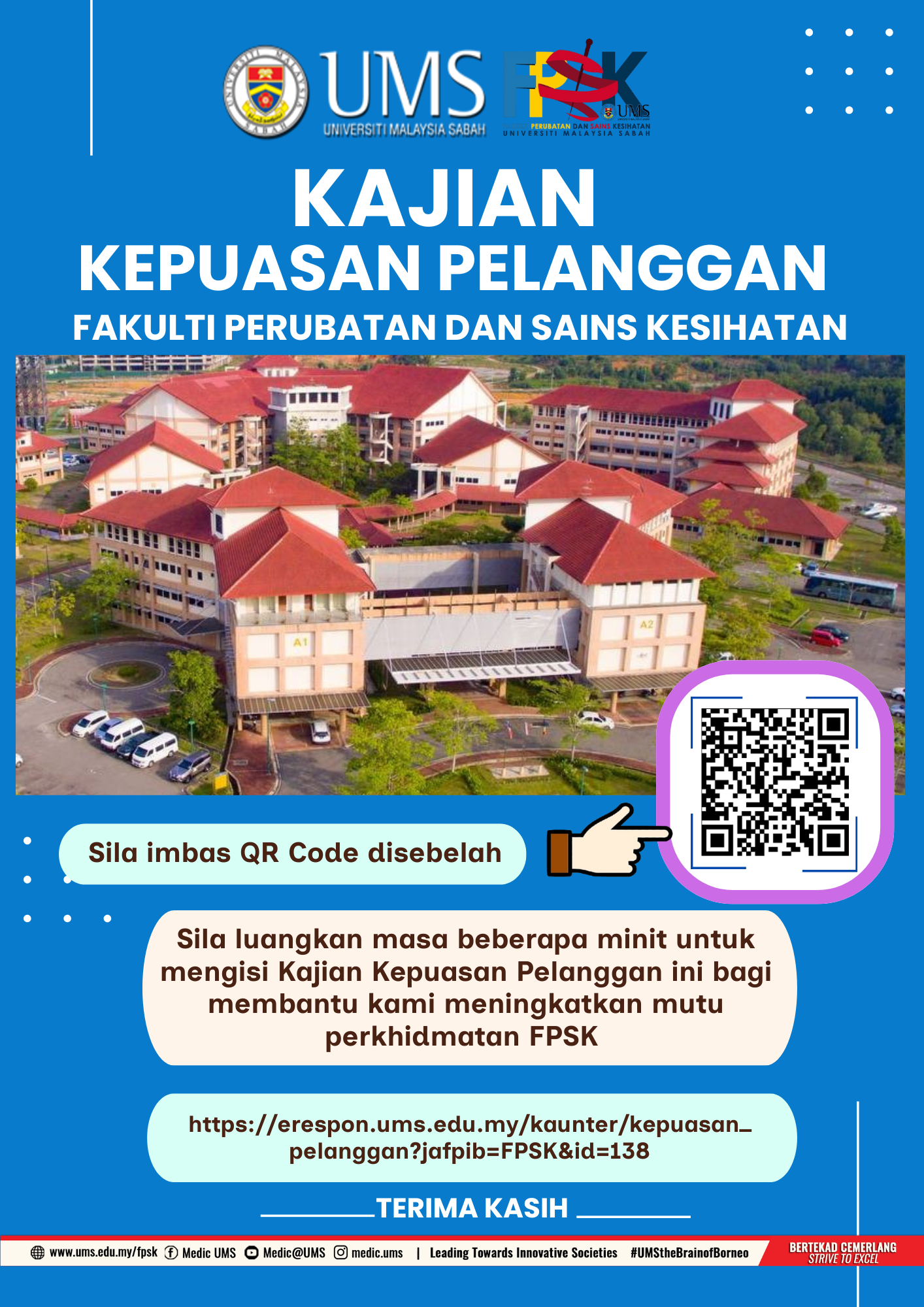 Mohon jasa baik YBhg. Datuk/Prof./Dr./Tuan/Puan/Cik agar dapat meluangkan sedikit masa untuk mengisi soal selidik kajian kepuasan pelanggan melalui pautan https://eoffice.ums.edu.my/e-respon/kepuasan_pelanggan.php?id=138&key=FPSK atau imbas kod QR yang tertera.