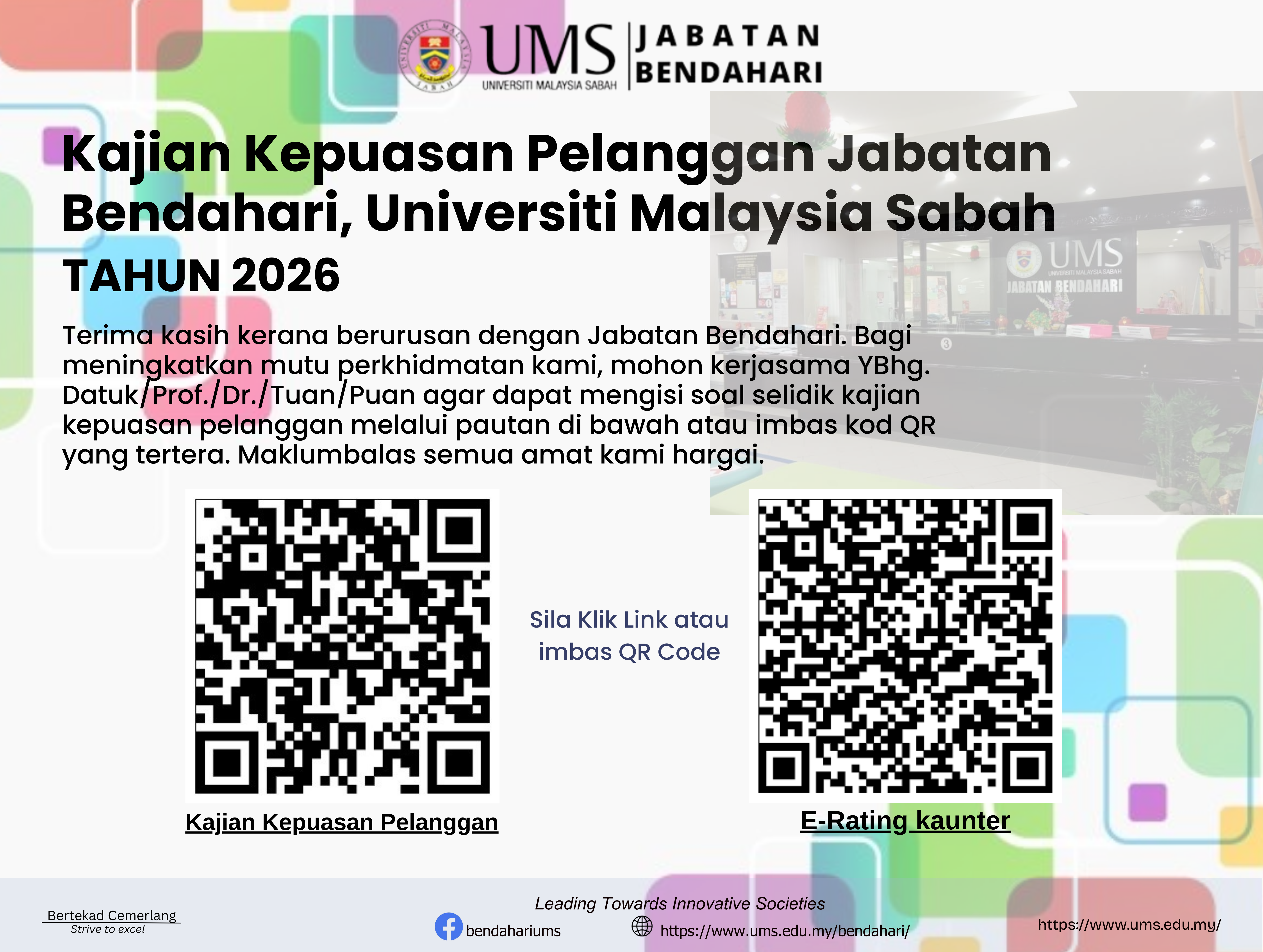 Sukacita dimaklumkan bahawa Jabatan Bendahari, UMS sedang melaksanakan Kajian Kepuasan Pelanggan bagi meningkatkan mutu dan kualiti perkhidmatan Jabatan.