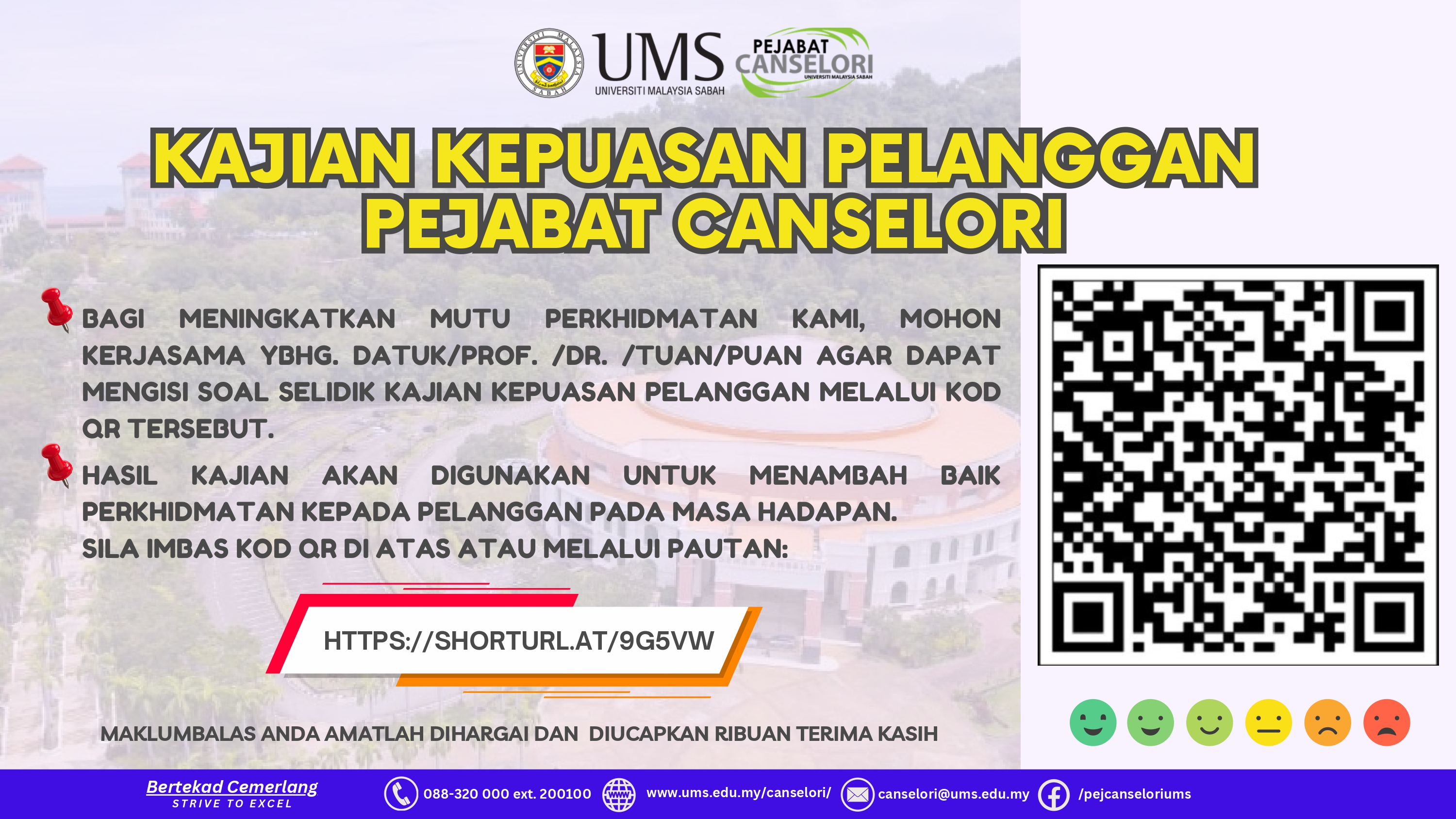 Bagi meningkatkan mutu perkhidmatan kami, mohon kerjasama YBrs. Prof./Dr./Tuan/Puan agar dapat mengisi soal selidik Kajian Kepuasan Pelanggan melalui QR Code tersebut. Maklumbalas anda amat kami hargai.