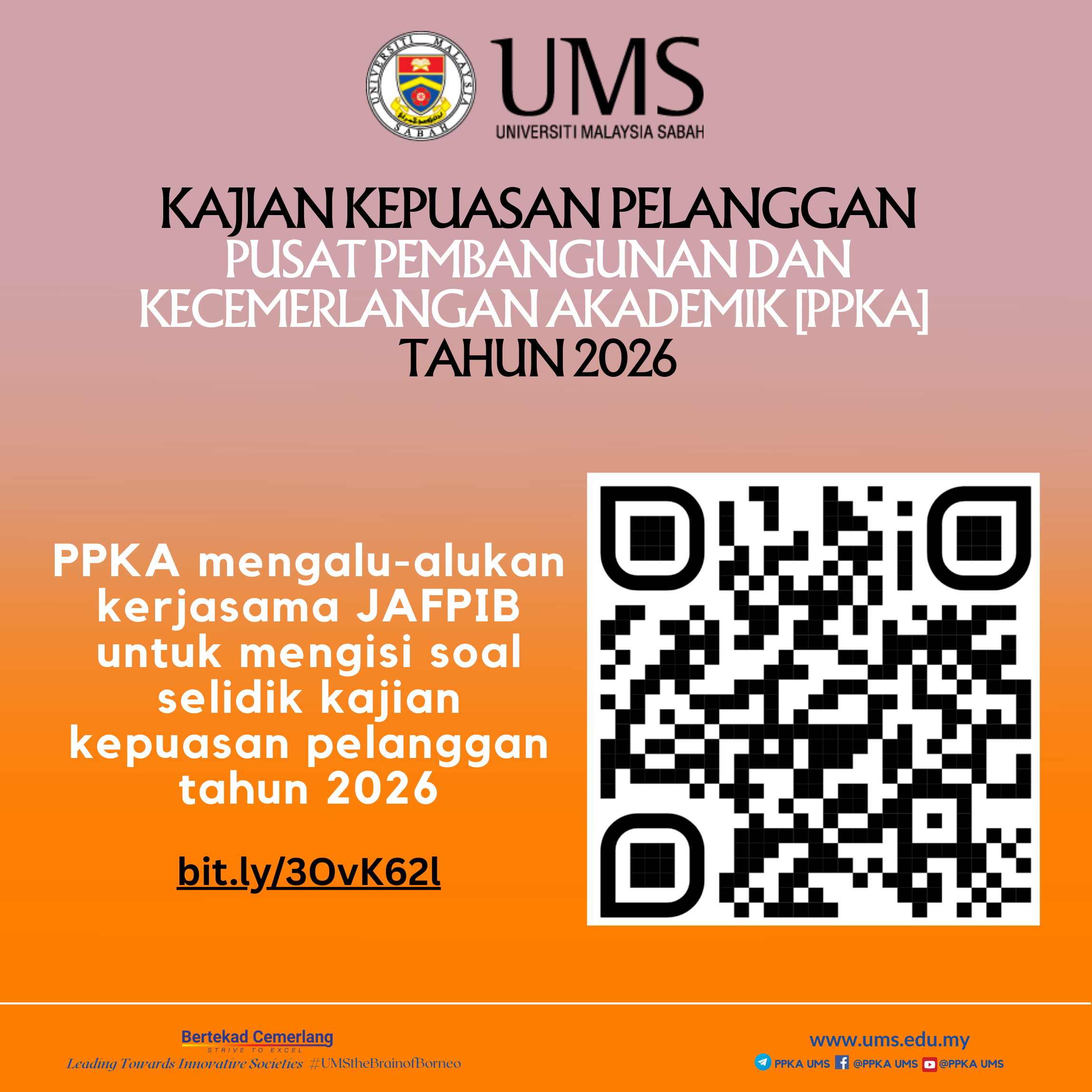 Pusat Pembangunan dan Kecemerlangan Akademik [PPKA] ingin mengucapkan terima kasih kerana menggunakan perkhidmatan kami. Bagi tujuan meningkatkan kualiti perkhidmatan PPKA, mohon jasa baik pihak YBhg. Datuk/Datin/Prof./Dr./Tuan/Puan agar dapat melengkapkan kaji selidik kepuasan pelanggan PPKA dengan mengimbas kod QR yang dipaparkan atau melalui pautan berikut: bit.ly/3OvK62l