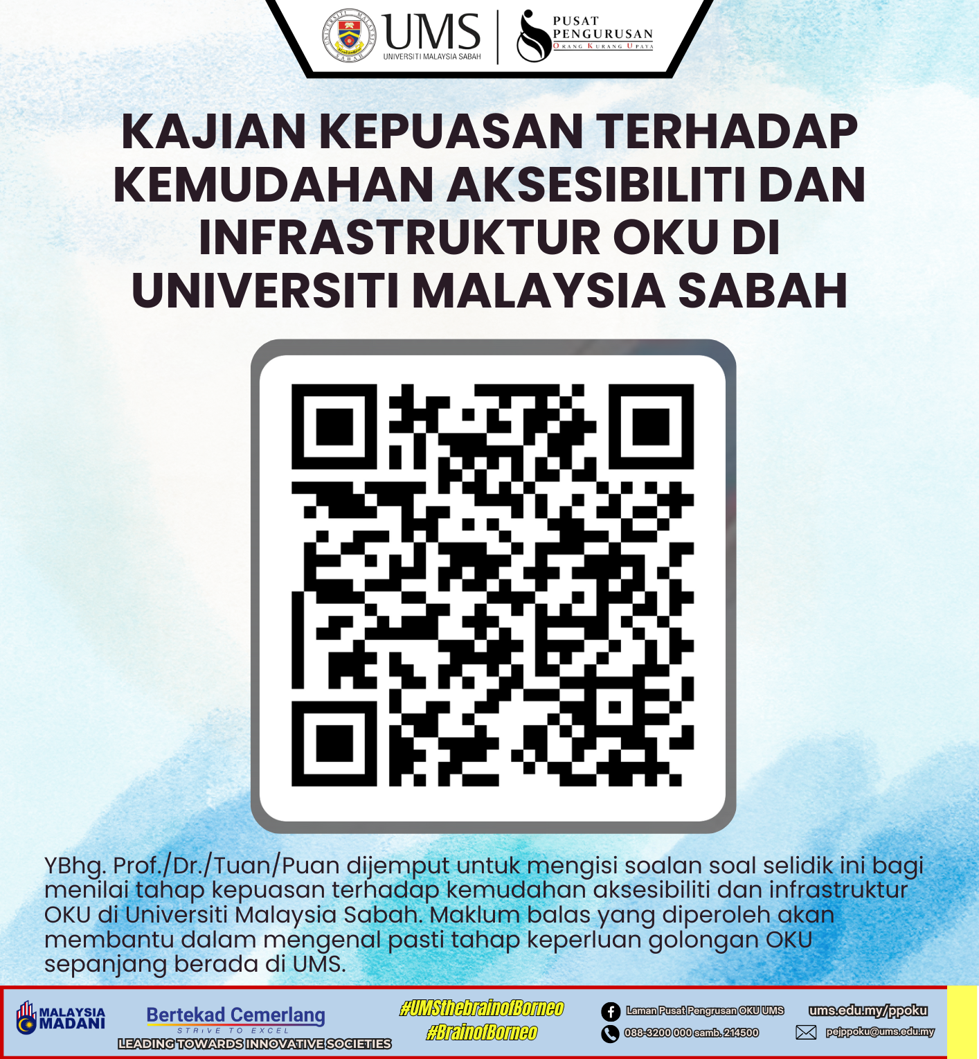 YBhg. Prof./Dr./Tuan/Puan dijemput untuk mengisi Kajian Kepuasan Terhadap Kemudahan Aksesibiliti dan Infrastruktur Orang Kurang Upaya di Universiti Malaysia Sabah melalui pautan https://forms.cloud.microsoft/r/6fkcxeU7AL atau melalui kod QR yang tertera bagi tempoh Januari hingga Februari 2026. Maklum balas anda amat dihargai bagi menambah baik kemudahan OKU di kampus ini.