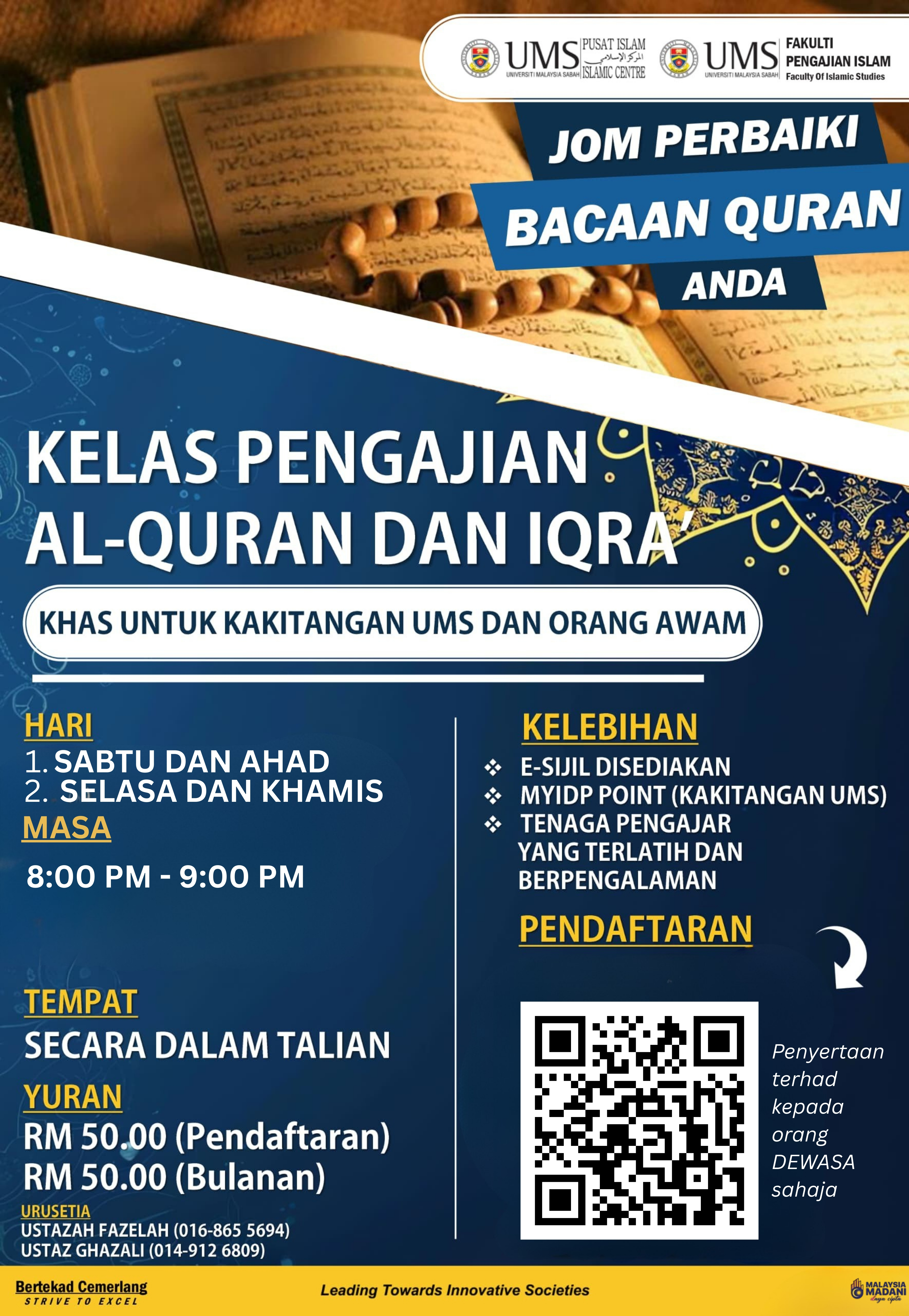 Pusat Islam Universiti Malaysia Sabah dengan Kerjasama Fakulti Pengajian Islam (FIS) menjemput dan mempelawa sesiapa yang berminat untuk membaca dan memperbaiki bacaan ayat-ayat suci Al-Quran Al-Karim secara praktikal melalui Kelas Pengajian Al-Quran dan Iqra'. Program ini terbuka kepada kakitangan UMS dan Orang Awam.