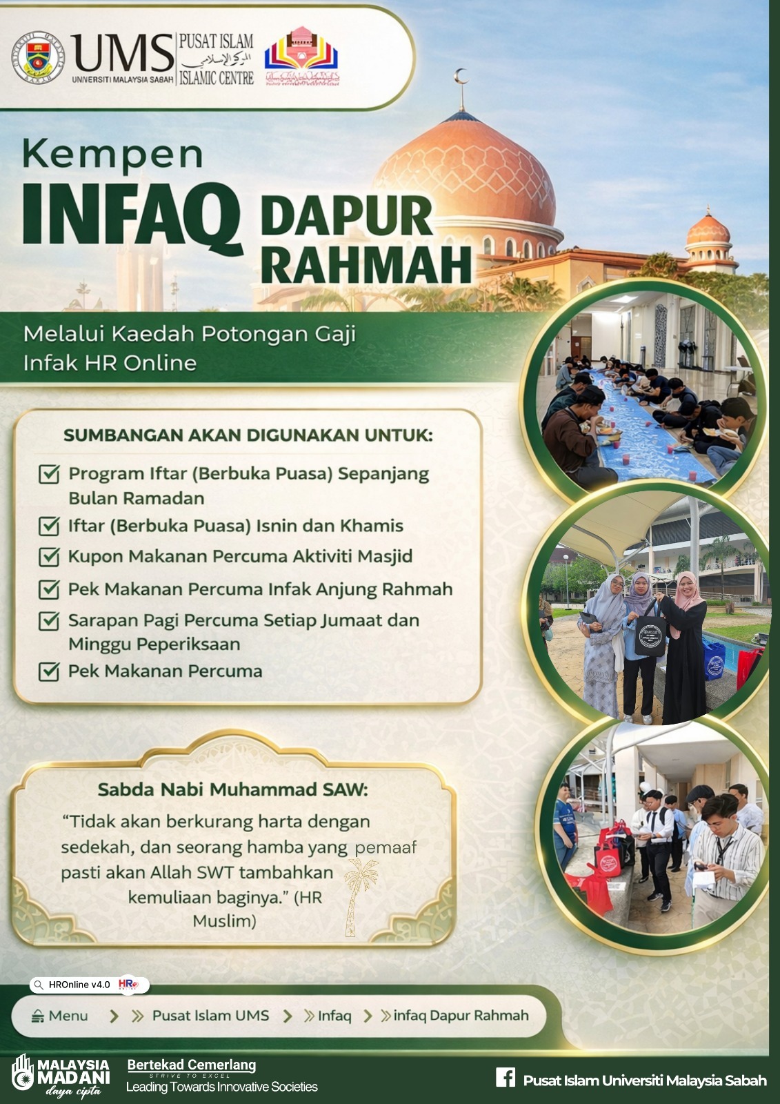 Mari bersama-sama menyemarakkan amalan infak dengan menyumbang melalui potongan gaji HR Online bagi menyokong Dapur Rahmah Pusat Islam UMS.