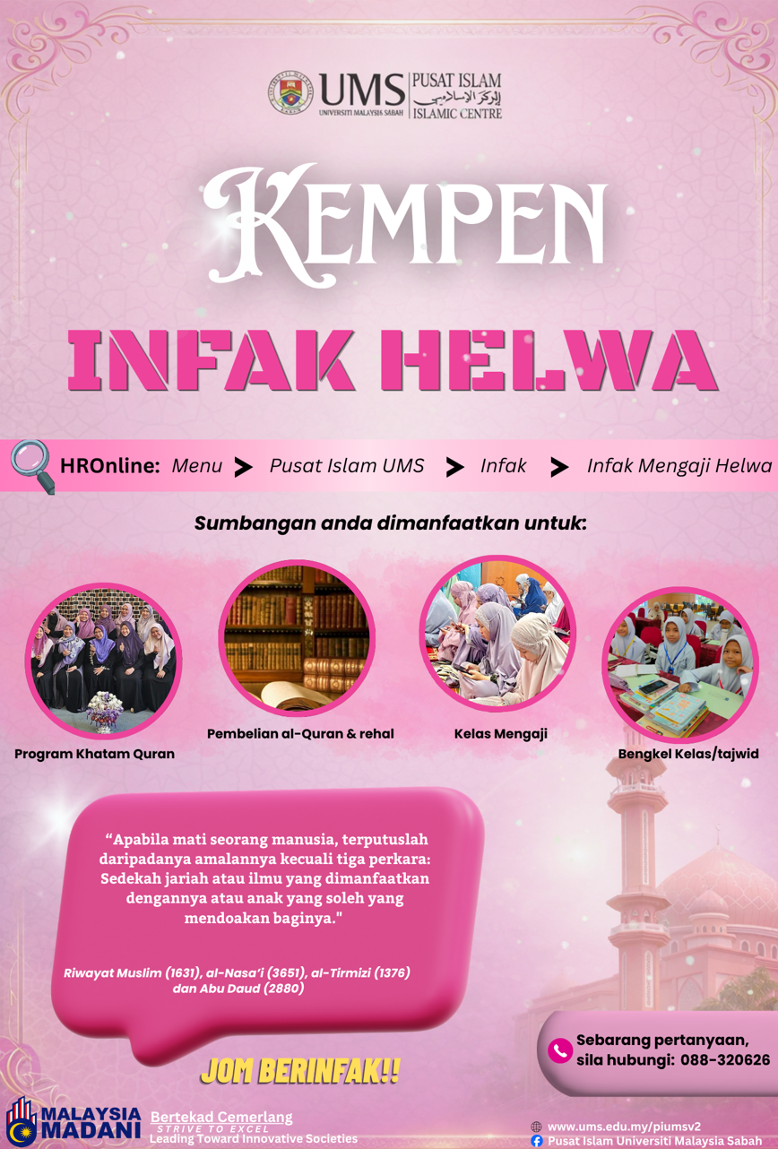 Infak bukan sekadar memberi, tetapi satu pelaburan akhirat yang berpanjangan. Sehubungan dengan itu, Pusat Islam Universiti Malaysia Sabah (UMS) dengan rendah hati menjemput seluruh warga UMS serta masyarakat awam untuk bersama-sama menyumbang melalui Infak HELWA yang dilaksanakan secara potongan gaji melalui sistem HR Online.