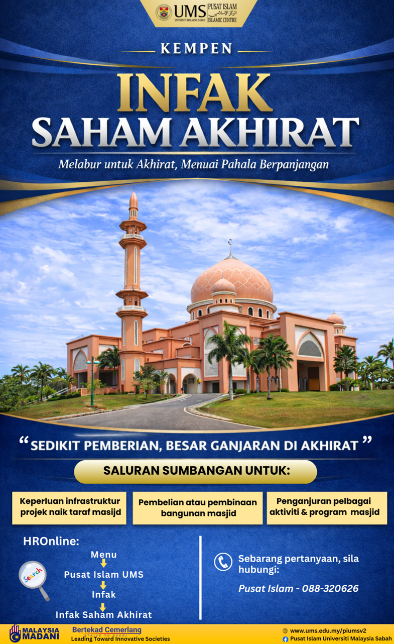 Marilah kita bersama-sama merebut peluang menanam saham akhirat yang tidak pernah rugi. Bersempena dengan Kempen Infak Saham Akhirat, Pusat Islam Universiti Malaysia Sabah (UMS) dengan penuh rasa rendah hati menjemput seluruh warga UMS serta masyarakat awam untuk turut sama menyumbang ke arah pembangunan dan pengimarahan Masjid UMS.
