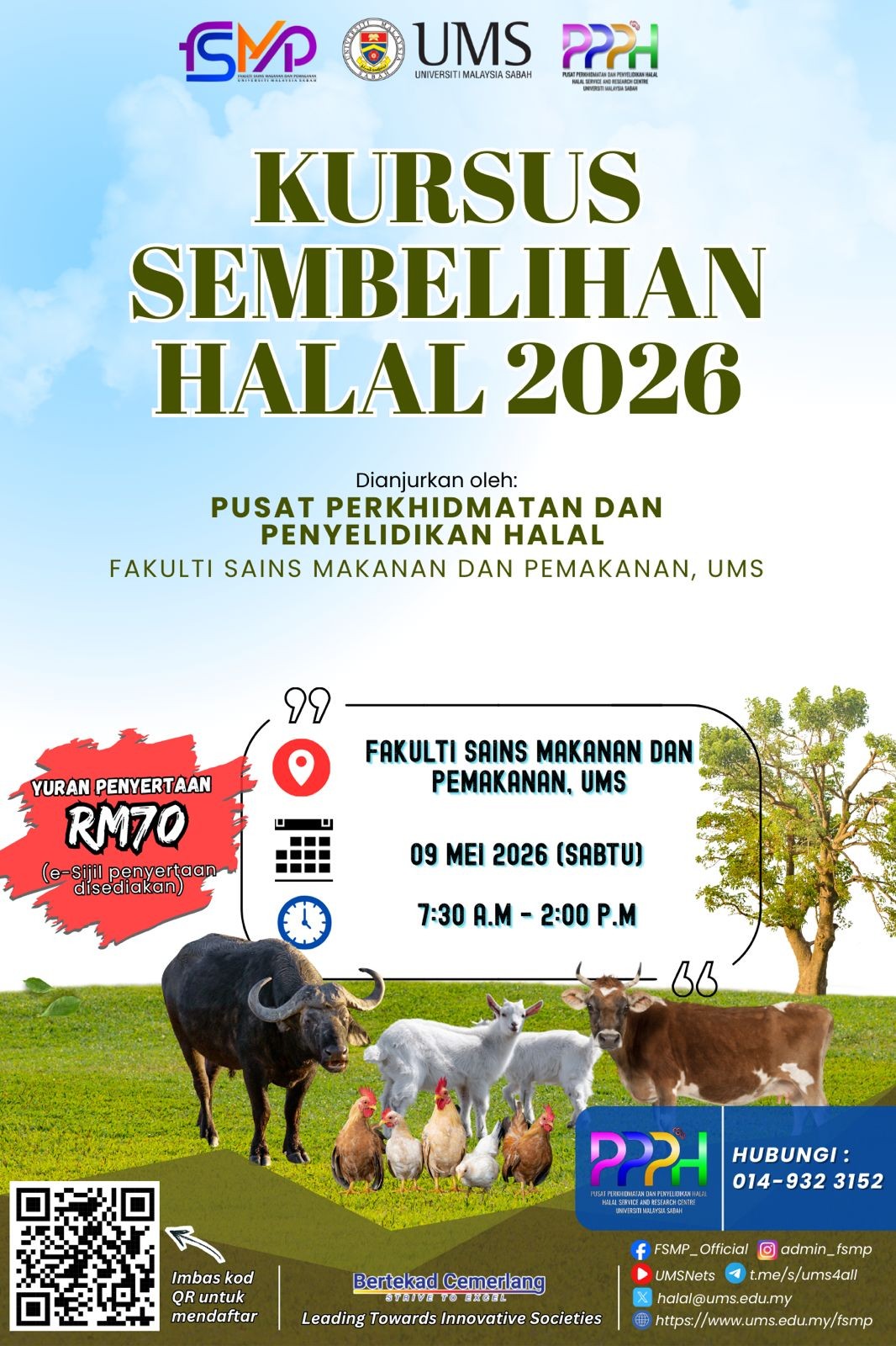 Kursus ini dianjurkan oleh Pusat Perkhidmatan dan Penyelidikan Halal (PPPH), Fakulti Sains Makanan dan Pemakanan, UMS dan sesuai kepada mereka yang berminat untuk mendalami ilmu sembelihan halal secara teori dan praktikal.