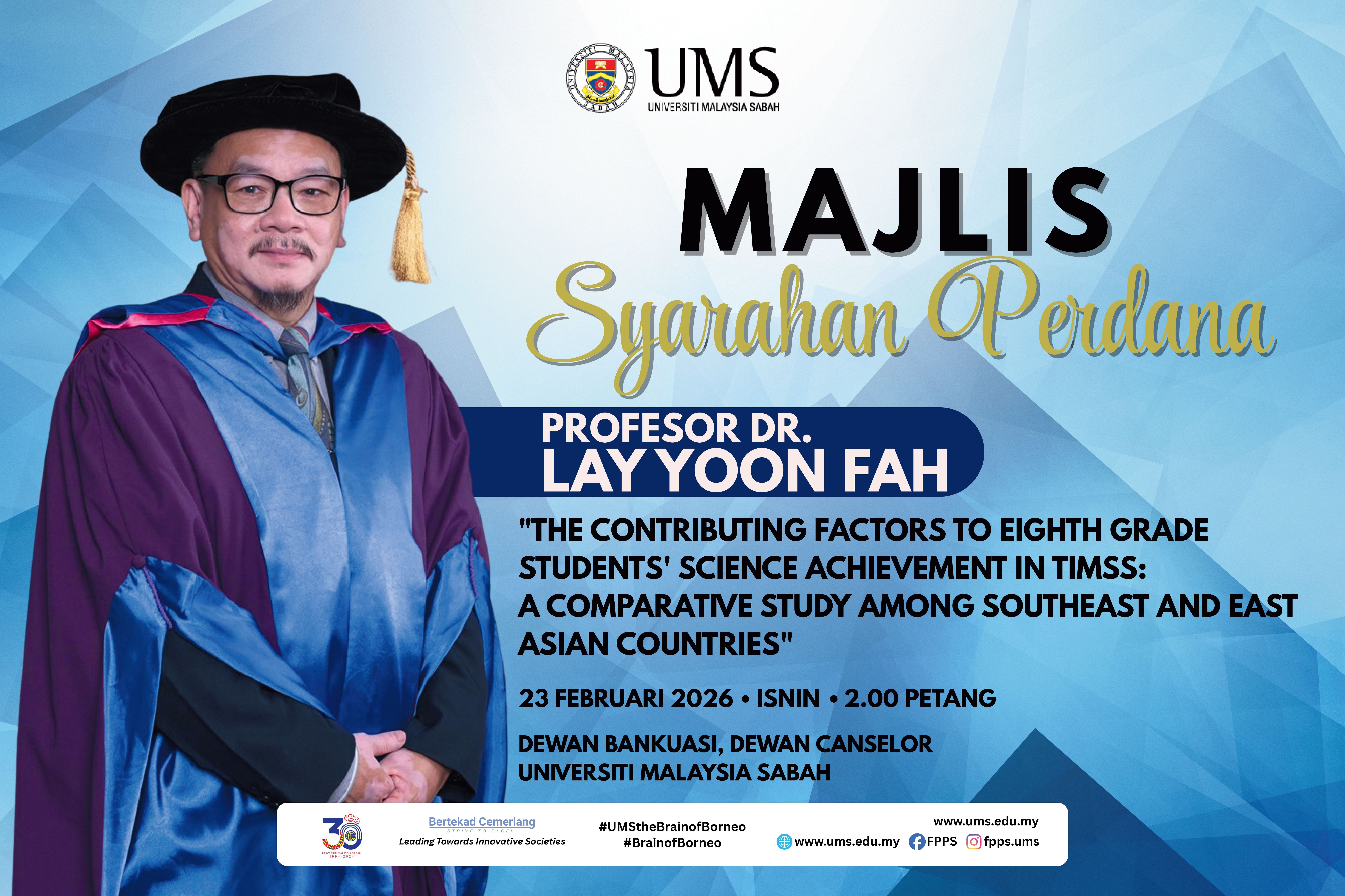 2. Sukacita dimaklumkan bahawa Majlis Syarahan Perdana, Universiti Malaysia Sabah oleh Profesor Dr. Lay Yoon Fah akan diadakan pada ketetapan seperti berikut: