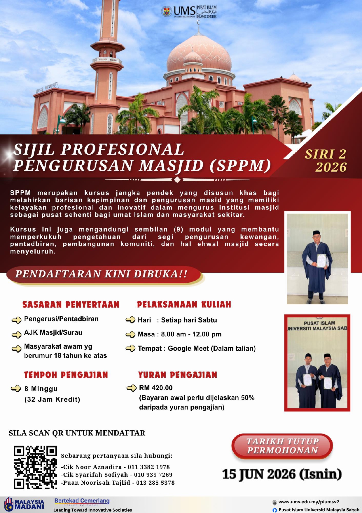 Sukacita dimaklumkan bahawa Unit Pengajian Islam Sepanjang Hayat (PISH), Pusat Islam Universiti Malaysia Sabah (UMS) dengan kerjasama Jabatan Hal Ehwal Agama Islam Negeri Sabah (JHEAINS) membuka pengambilan peserta bagi Sijil Profesional Pengurusan Masjid (SPPM) Siri 2 Sesi 2026. Butiran program adalah seperti berikut: