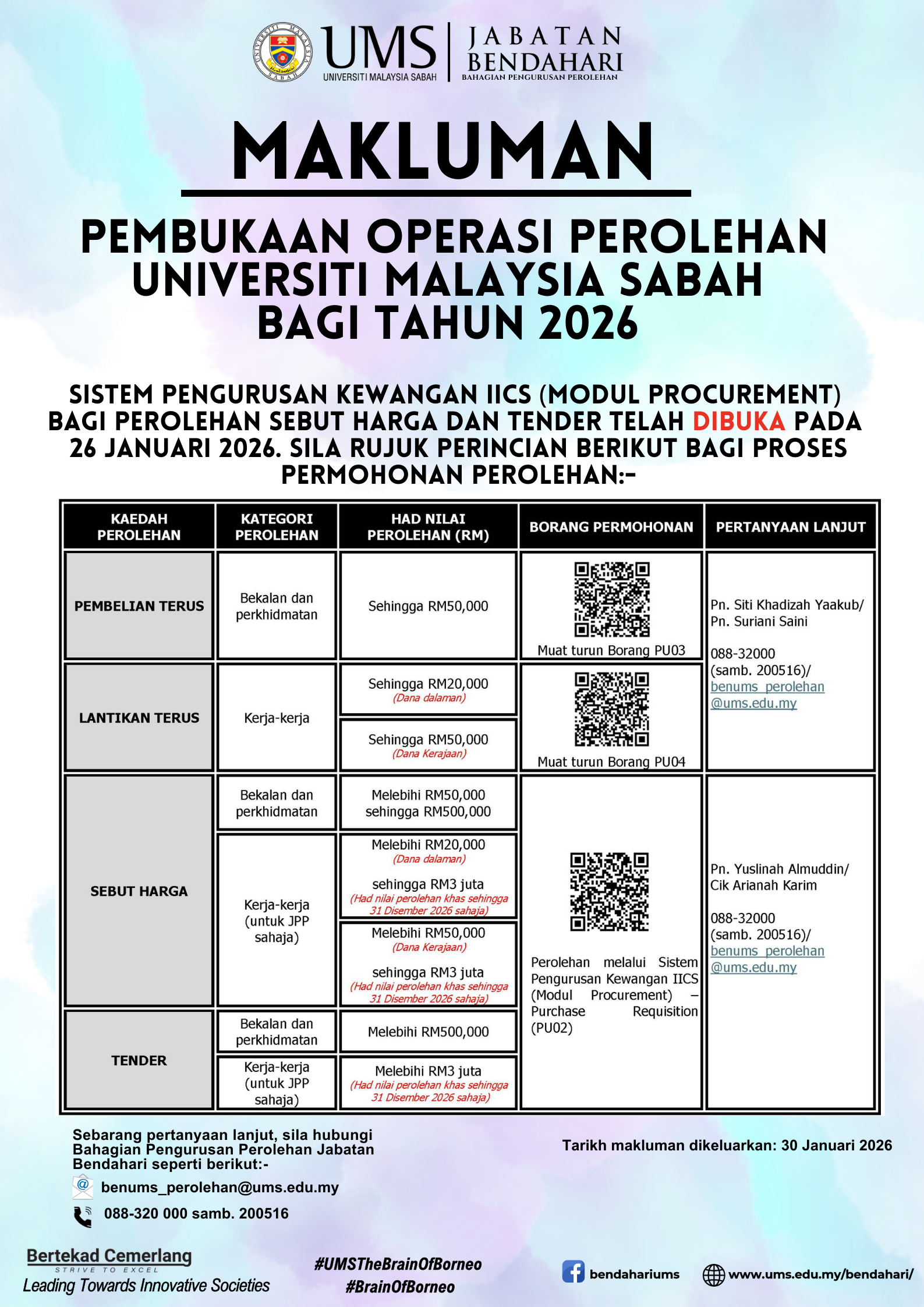 MAKLUMAN PEMBUKAAN OPERASI PEROLEHAN UNIVERSITI MALAYSIA SABAH BAGI TAHUN 2026