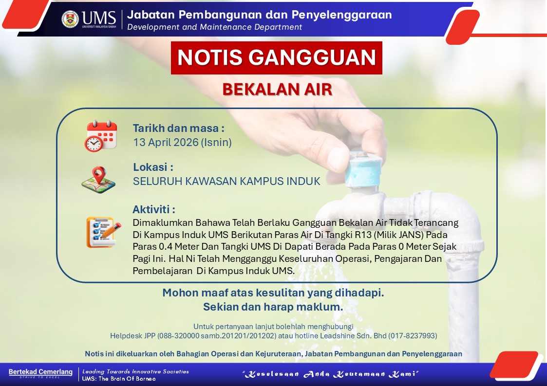 Dimaklumkan bahawa telah berlaku Gangguan Bekalan Air Tidak Terancang di Kampus Induk UMS berikutan paras air di Tangki R13 (Milik JANS) pada paras 0.4 meter sejak pagi ini.