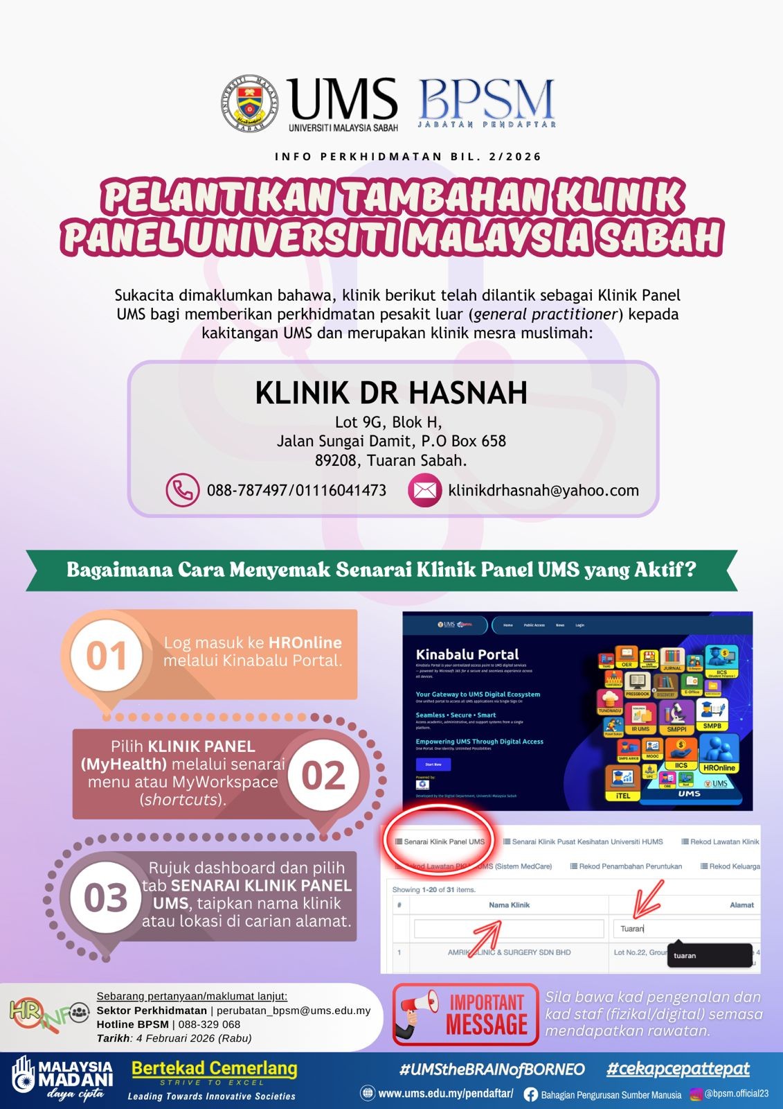Ada berita baik untuk rakan-rakan yang tinggal atau sering berulang-alik ke kawasan Tuaran. UMS kini telah melantik Klinik Dr Hasnah sebagai Klinik Panel tambahan yang aktif bermula sekarang!