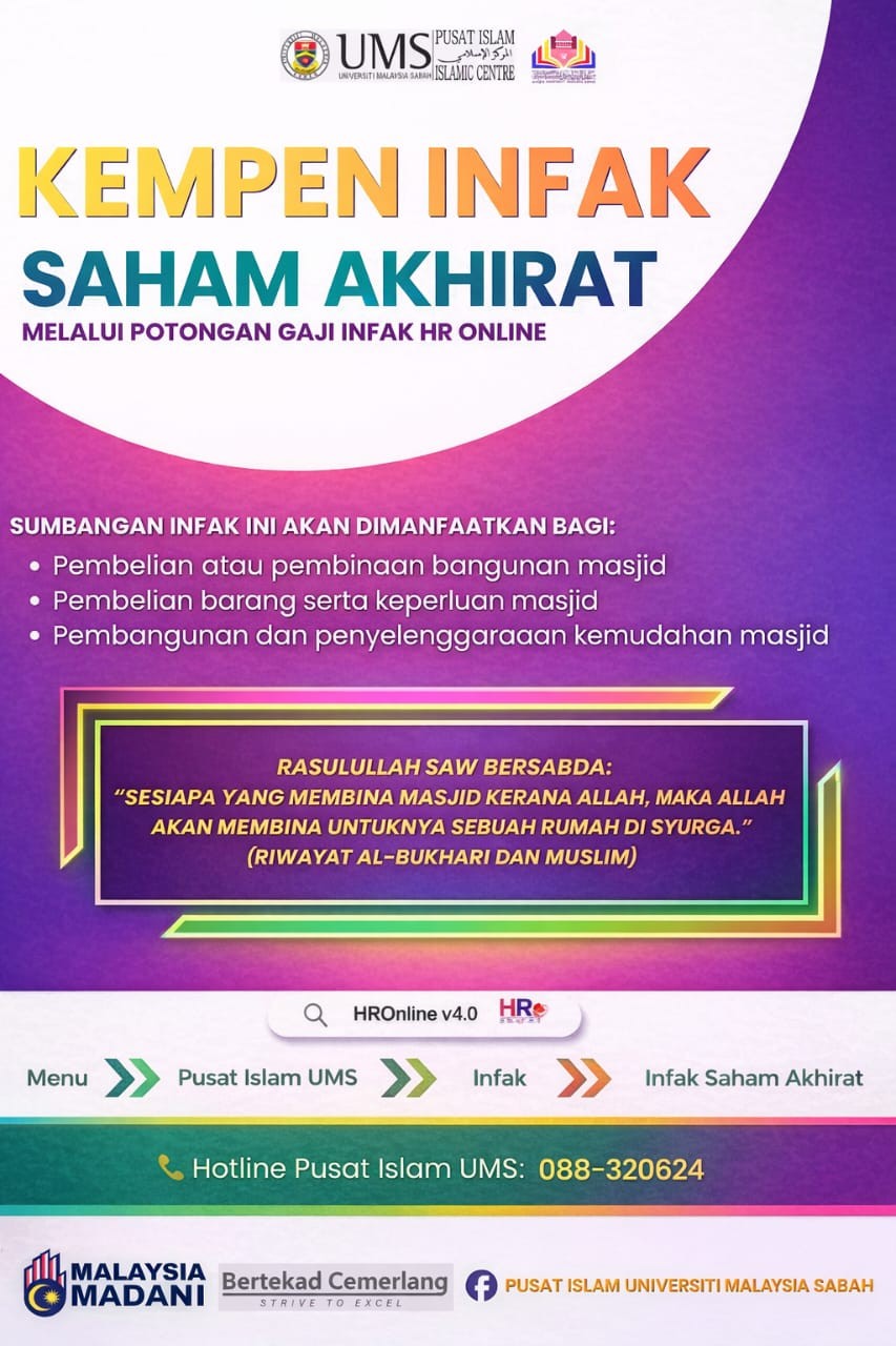 Rebut peluang menabung saham akhirat melalui Infak Pusat Islam UMS yang boleh disertai secara potongan gaji melalui HR Online UMS. Infak anda bukan sekadar sumbangan, tetapi pelaburan akhirat yang berterusan pahalanya.