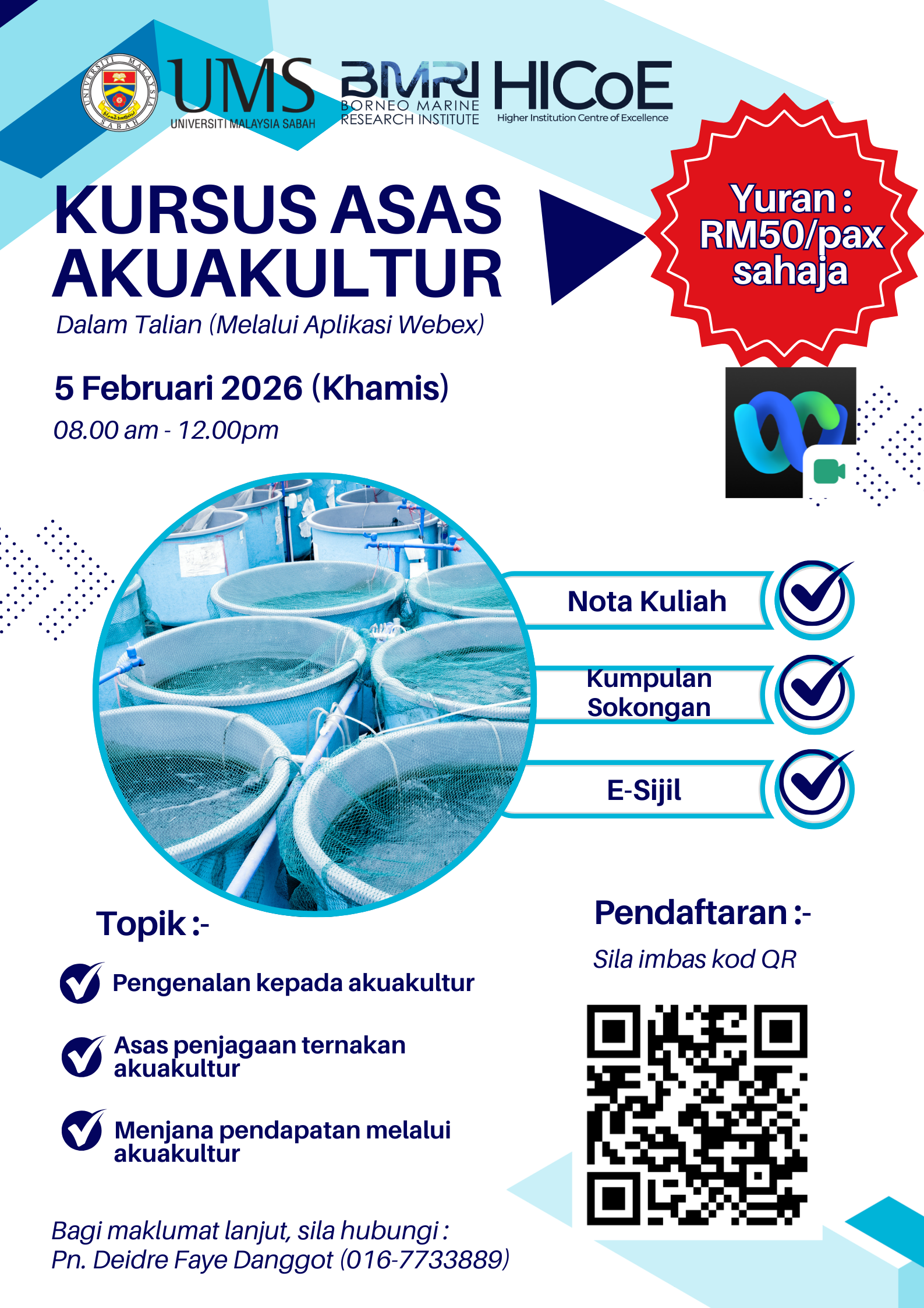 Institut Penyelidikan Marin Borneo akan mengadakan "Kursus Asas Akuakultur" (Dalam Talian) pada 5 Februari 2026 (Khamis).
