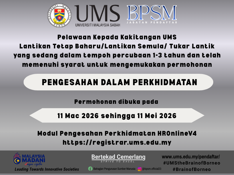 2. Sukacita dimaklumkan bahawa, pihak Bahagian Pengurusan Sumber Manusia (BPSM), Jabatan Pendaftar mempelawa kepada semua kakitangan UMS Lantikan tetap/ baharu/lantikan semula/ tukar lantik yang memenuhi syarat untuk mengemukakan permohonan Pengesahan Dalam Perkhidmatan melalui modul modul Pengesahan Perkhidmatan HROnlineV4: https://registrar.ums.edu.my/